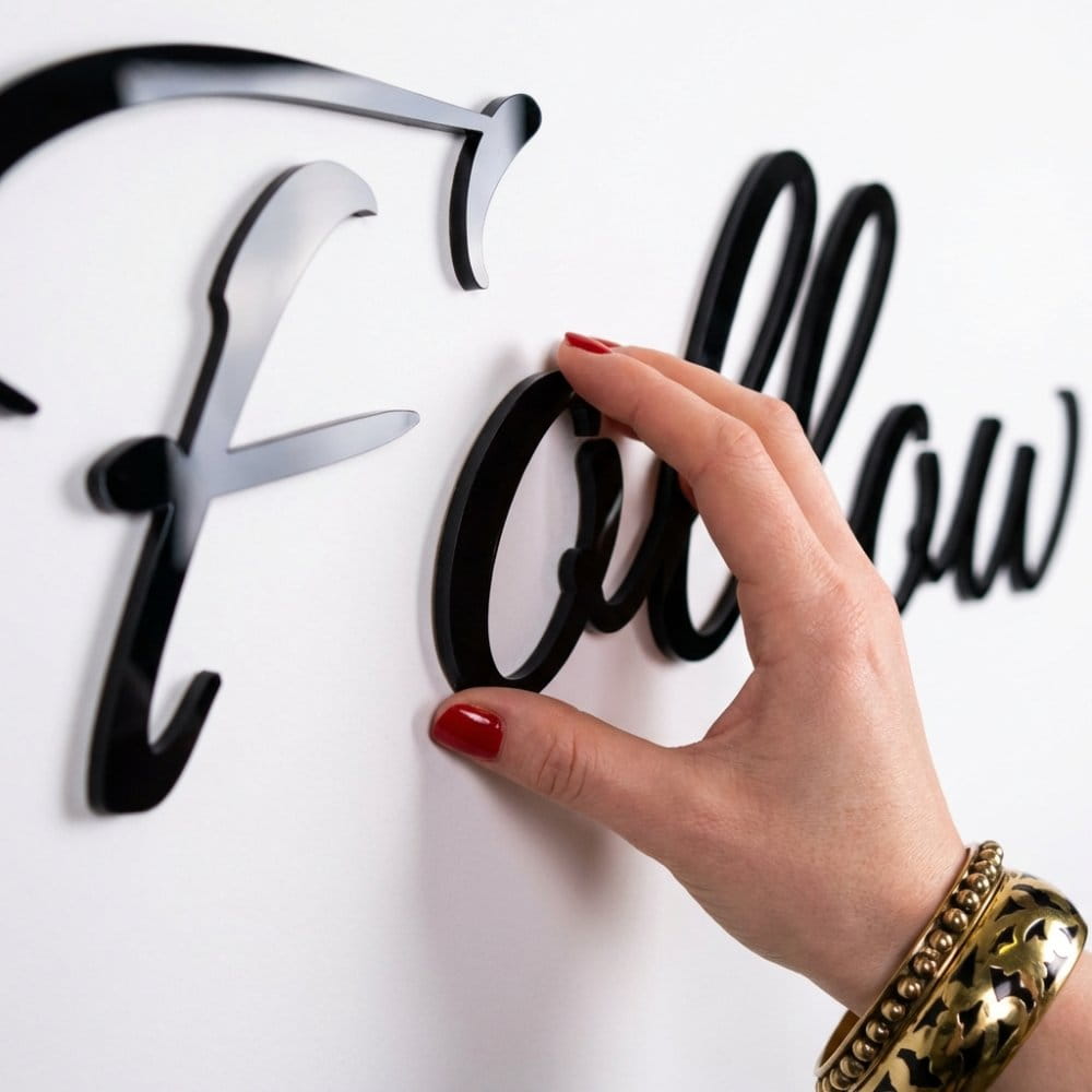 Design łączy w sobie elegancję ręcznie pisanego kroju czcionki dla słowa "Follow" z nowoczesną prostotą liter bezszeryfowych w wyrażeniach "your dreams". Ten kontrast nadaje kompozycji świeży i unikatowy wygląd, jednocześnie zachowując jej czytelność i harmonijną całość.