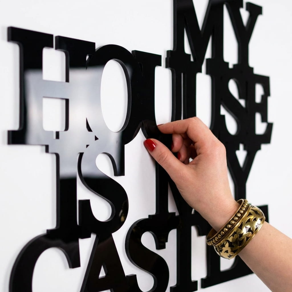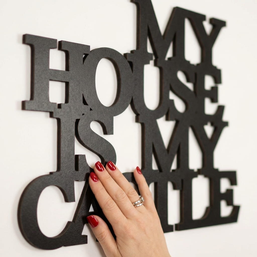 Napis ścienny "MY HOUSE IS MY CASTLE" - znane angielskie przysłowie, podkreślające wagę własnego miejsca jako azylu i twierdzy.