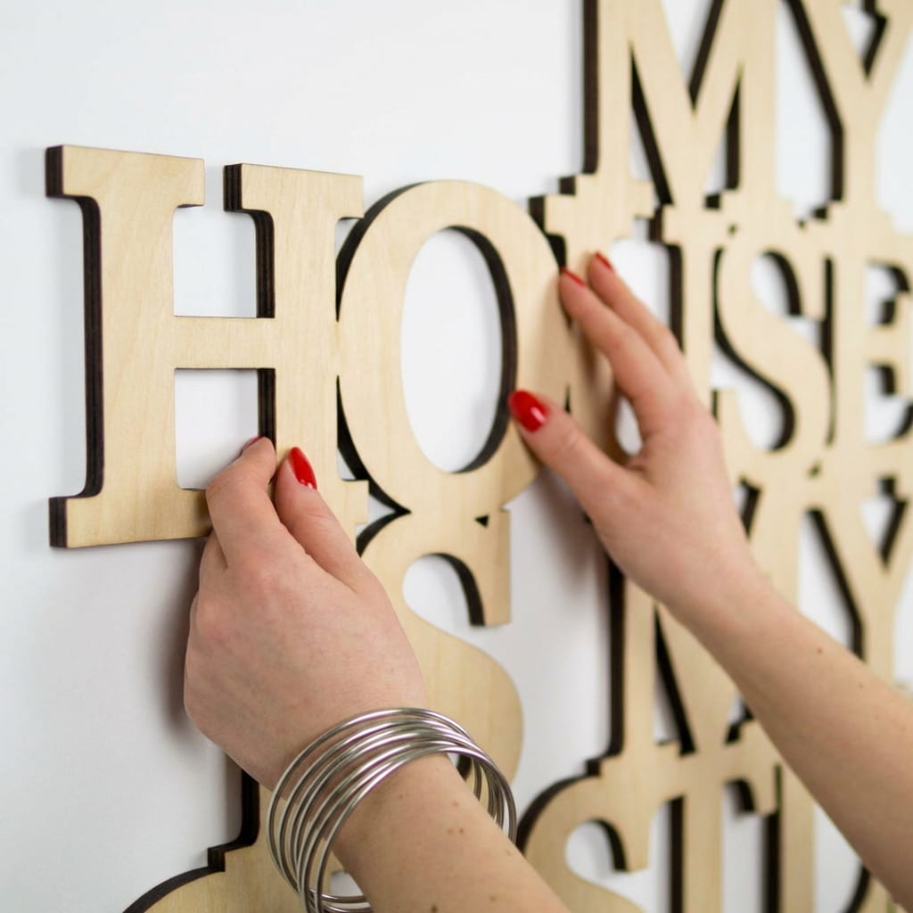 Projekt został wykonany laserem co2 z dużą precyzją, a litery o prostej, bezszeryfowej czcionce tworzą spójną bryłę. Każdy element w naszej pracowni jest ręcznie wykańczany i starannie pakowany, co świadczy o unikalnym rzemiośle.