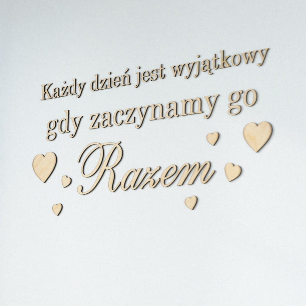 Napisy na ścianę Każdy dzień jest wyjątkowy gdy zaczynamy go razem. Do liter dołączone są również serduszka.
