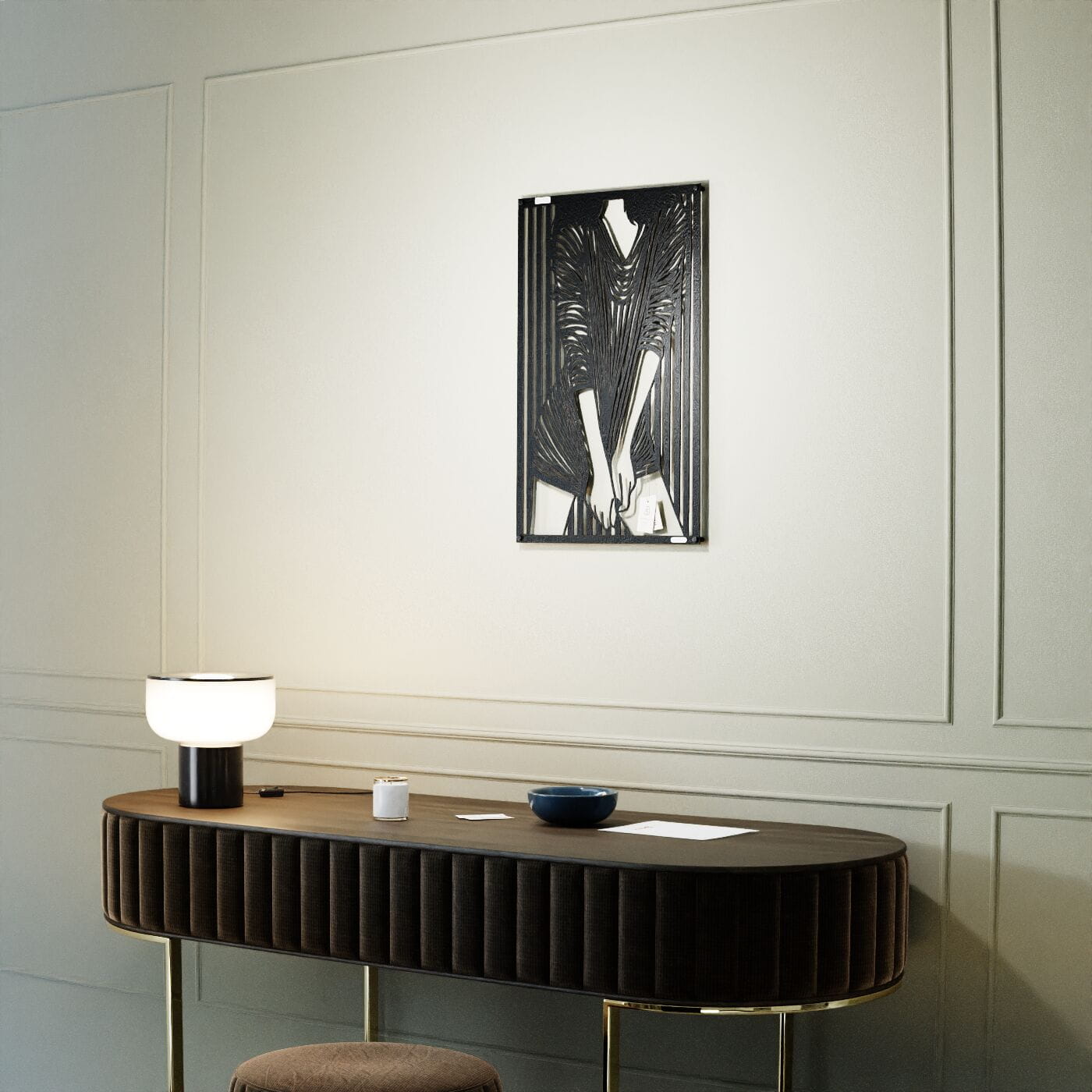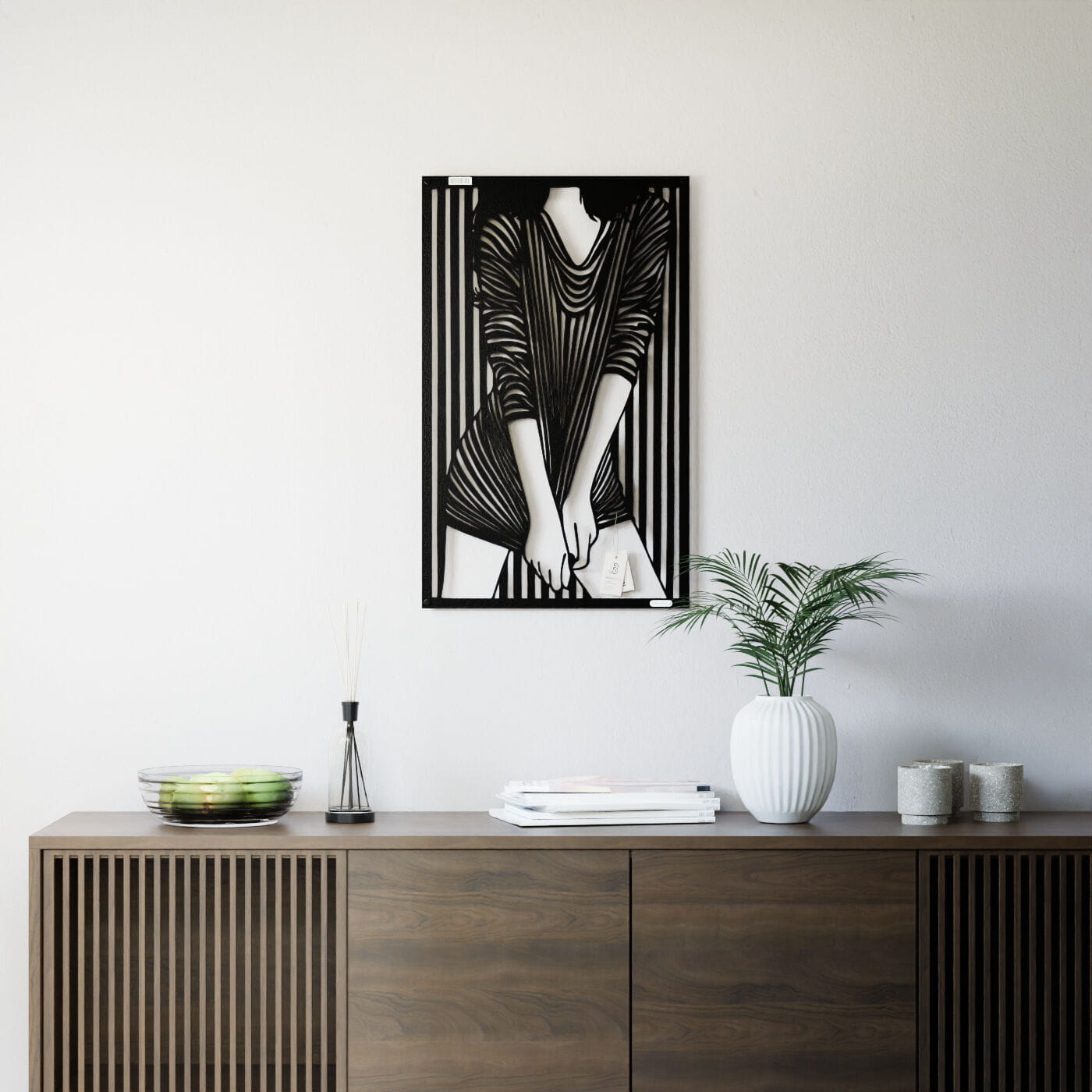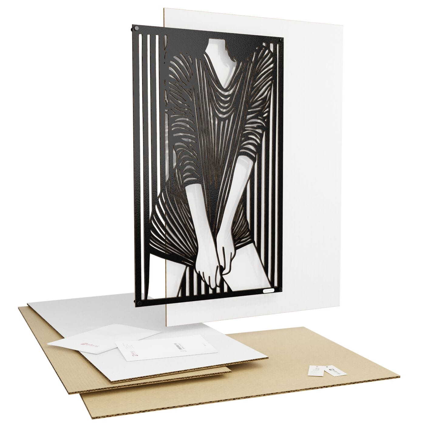 Panel dekoracyjny kobietaPrzestrzenny ażurowy panel 3D kobieta - to nowoczesna ozdoba ścienna, która w subtelny sposób ukazuje elegancką sylwetkę kobiety. Przedstawiona postać ubrana w dopasowaną sukienkę w paski, które dynamicznie układają się na tle, tworzy efekt głębi i ruchu. Zastosowanie tego prostego, a jednocześnie wyrazistego motywu dodaje całości artystycznego wyrazu. Wzór panelu opiera się na graficznej grze kontrastów, która idealnie komponuje się z nowoczesnymi i minimalistycznymi wnętrzami. Dekoracja ścienna ażurowa w tym wydaniu doskonale sprawdzi się jako niebanalny dodatek do loftowych lub industrialnych przestrzeni, wprowadzając odrobinę oryginalności i elegancji. Ten panel ścienny z pewnością przypadnie do gustu miłośnikom sztuki współczesnej, którzy szukają unikalnych i niepowtarzalnych elementów dekoracyjnych do swojego domu.