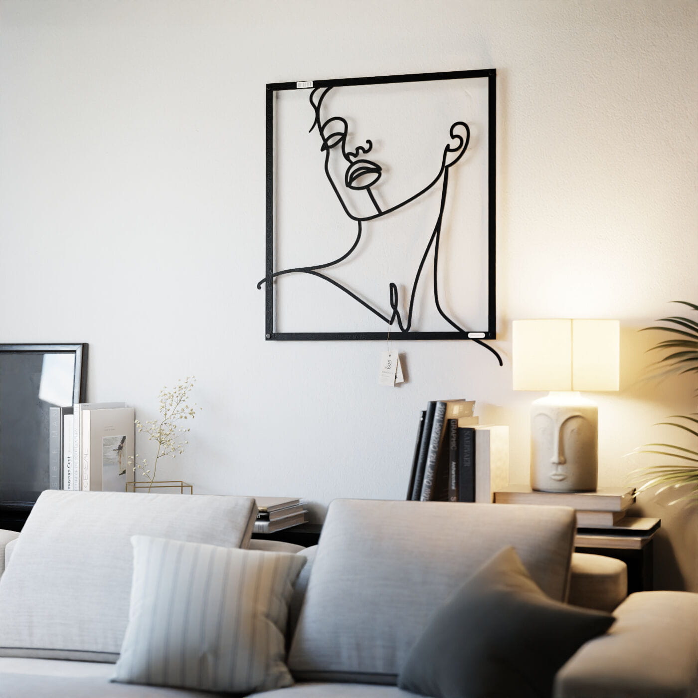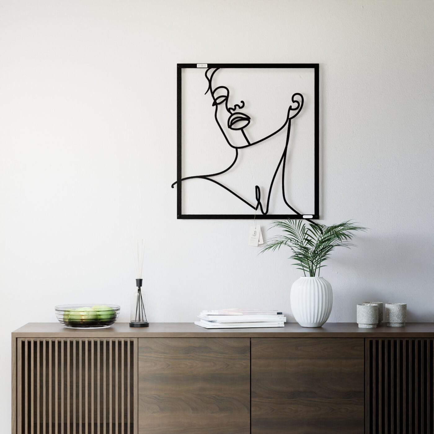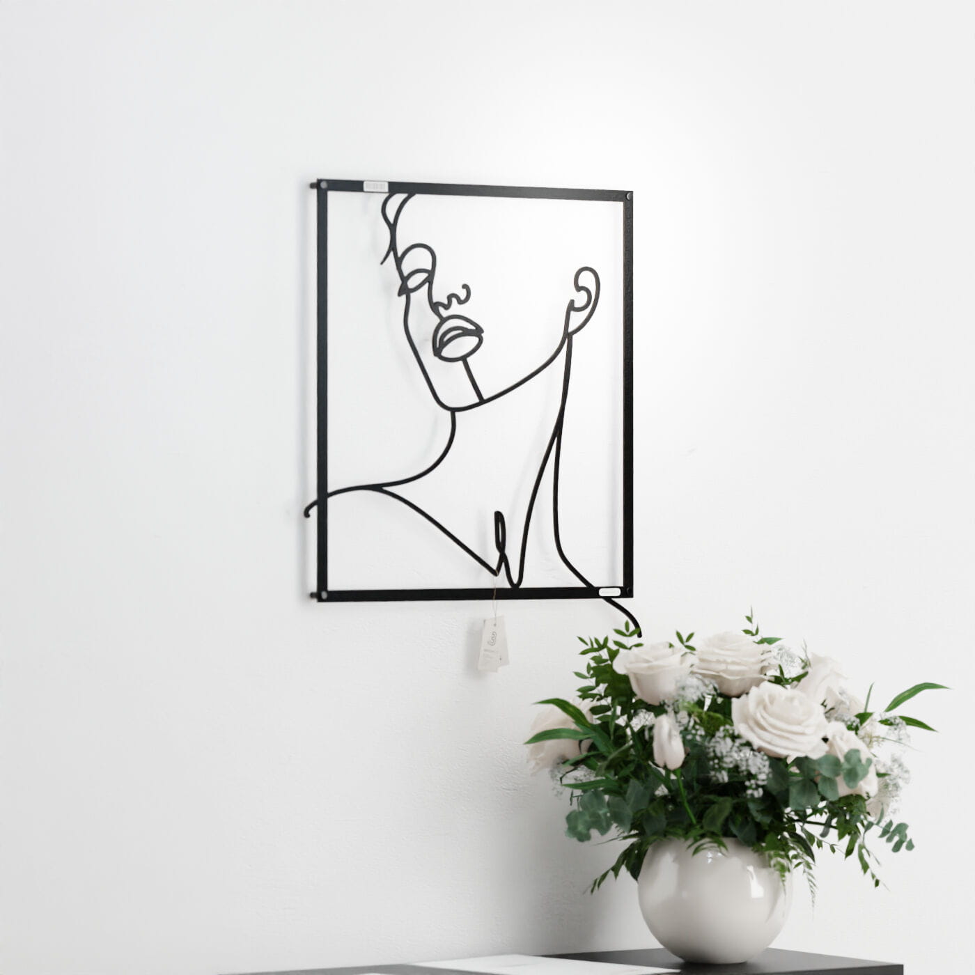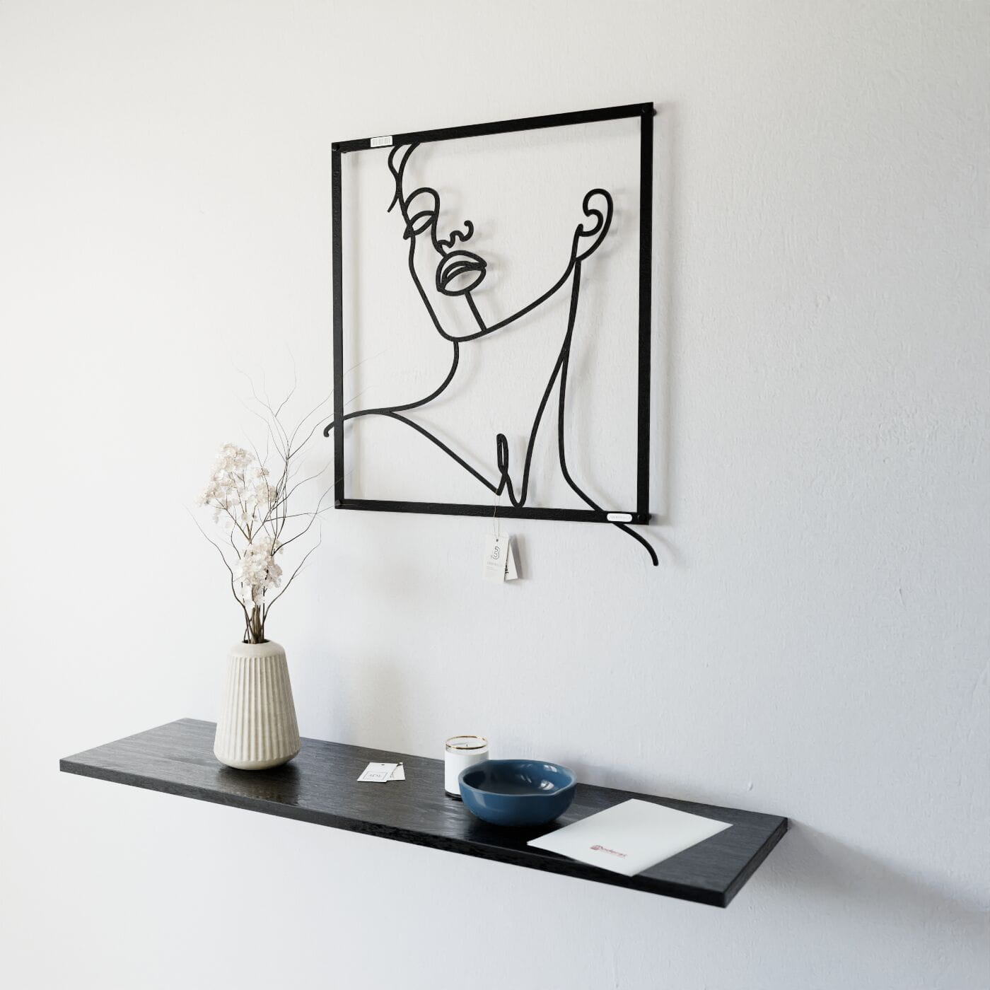 Panel line art kobietaDekoracja ażurowa z motywem kobiecej twarzy wprowadza do wnętrza subtelność i nowoczesny minimalizm. Wzór, który przedstawia liniowy szkic kobiety z uniesioną głową, oddaje uczucie spokoju i zamyślenia. Gładko poprowadzone linie wyrażają delikatność twarzy, podkreślając naturalne piękno i łagodność sylwetki. Wycięcie laserowe gwarantuje precyzję detali, a lekkość konstrukcji sprawia, że panel jest łatwy w montażu i nie obciąża ściany. Zamontowany przy użyciu dystansów, odstaje od powierzchni ściany, tworząc intrygujący efekt trójwymiarowości. To drewniane dzieło sztuki wykonane z sklejki lub drewnianej płyty laminowanej doskonale komponuje się z nowoczesnymi, jak i bardziej klasycznymi aranżacjami wnętrz.
