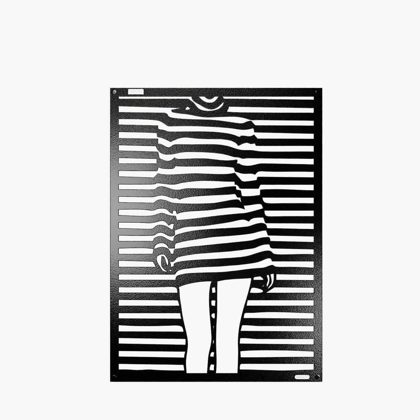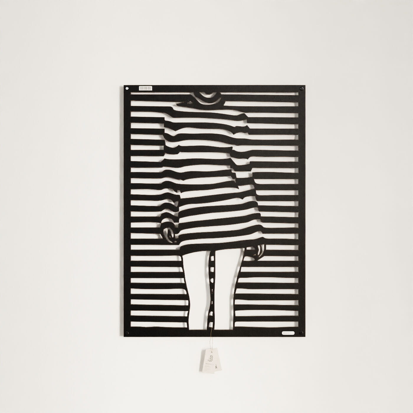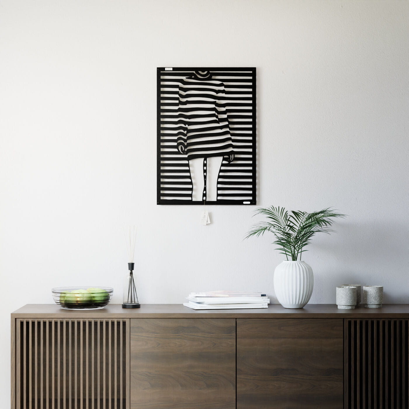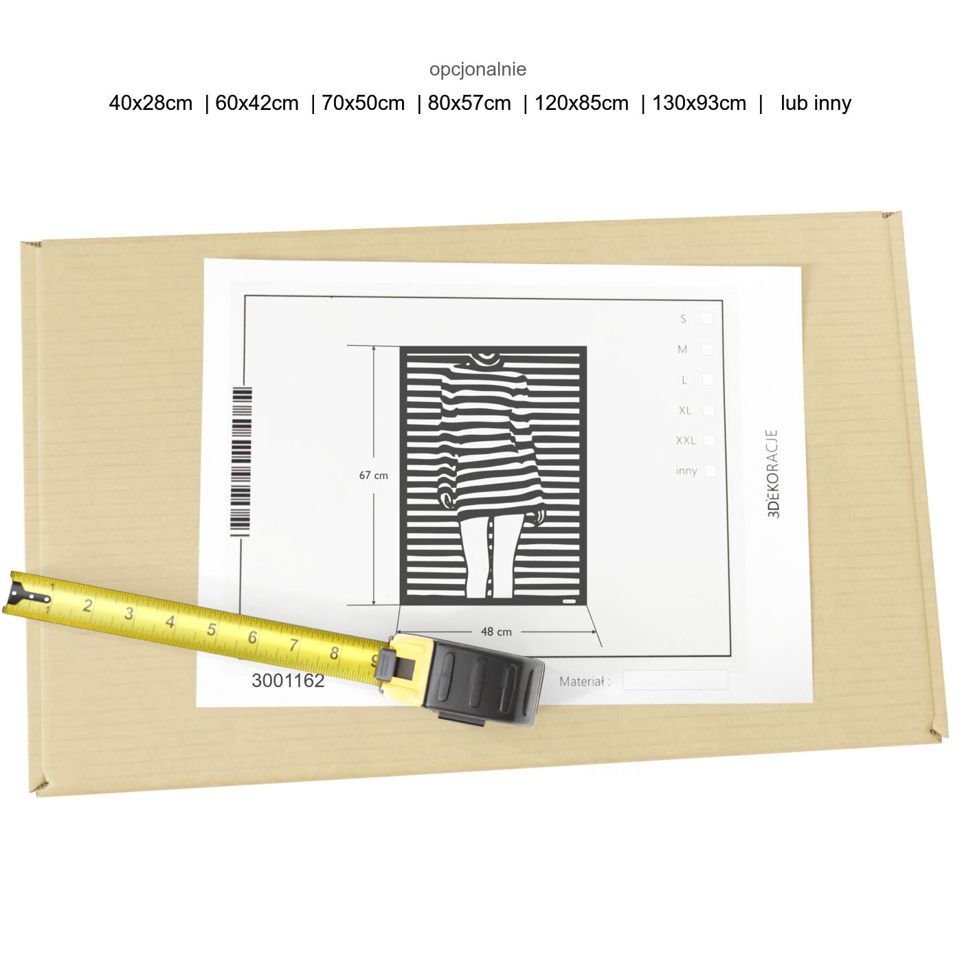 Panel dekoracyjny kobieta w pasyPanel dekoracyjny 3d "Kobieta w pasy" to nowoczesna ozdoba ścienna, która przyciąga wzrok nietypowym, dynamicznym wzorem. Kompozycja przedstawia postać kobiety ubranej w sukienkę w czarno-białe poziome pasy, które doskonale komponują się z tłem, tworząc iluzję ruchu i głębi. Zastosowanie takiego motywu dodaje projektowi unikalnego charakteru, a zarazem zachowuje jego minimalistyczną estetykę. Ta dekoracja ażurowa zaskakuje swoją prostotą, ale jednocześnie intryguje. Równomierne pasy przeplatają się, nadając całości lekkiego i nowoczesnego wyglądu. Wzór doskonale wpasuje się w przestrzenie urządzone w stylu industrialnym, nowoczesnym lub loftowym, wprowadzając do wnętrza świeży akcent. Panel ścienny "Kobieta w pasy" to idealny wybór dla osób, które cenią sobie nietuzinkowe dekoracje i chcą dodać odrobinę artystycznej dynamiki do swojego wnętrza.