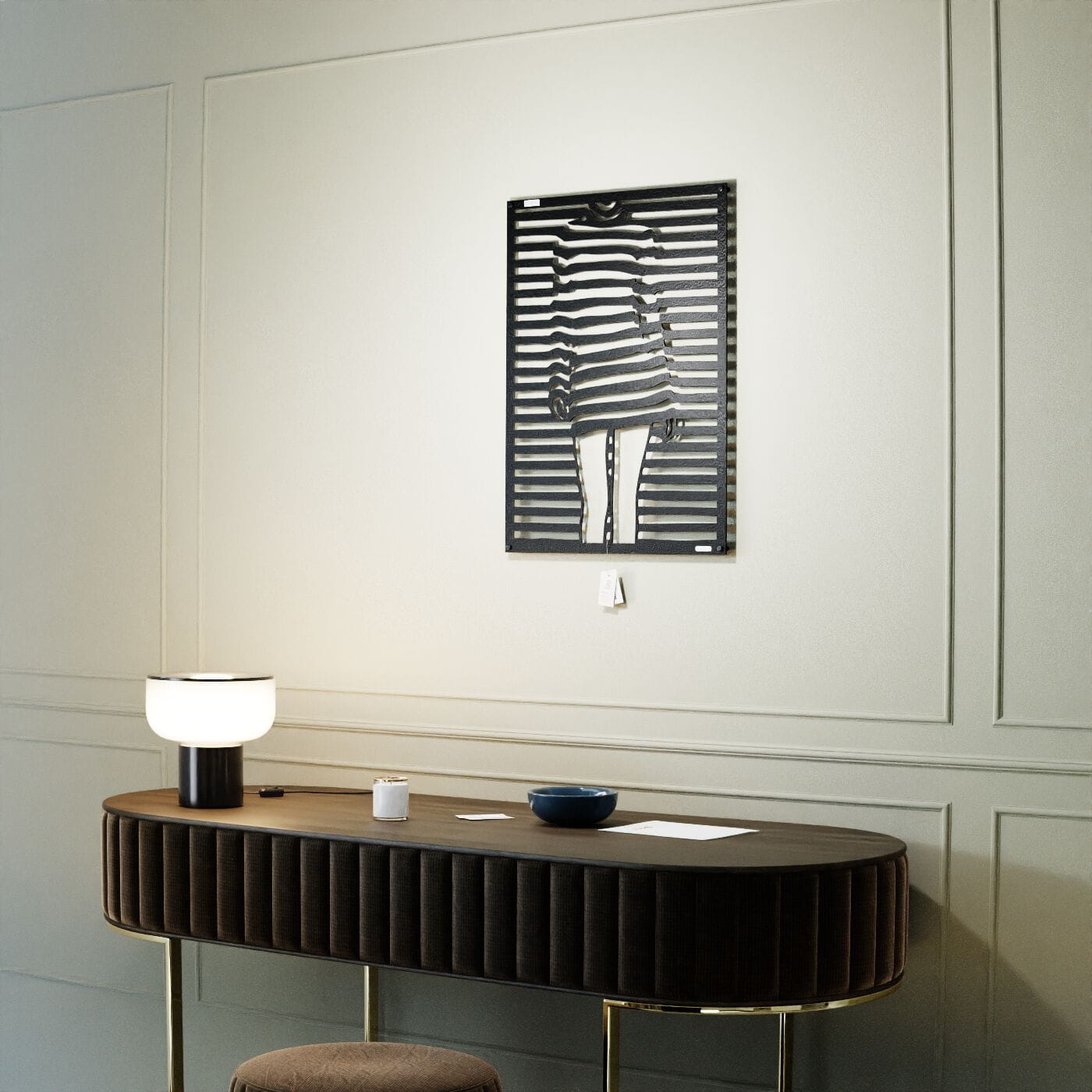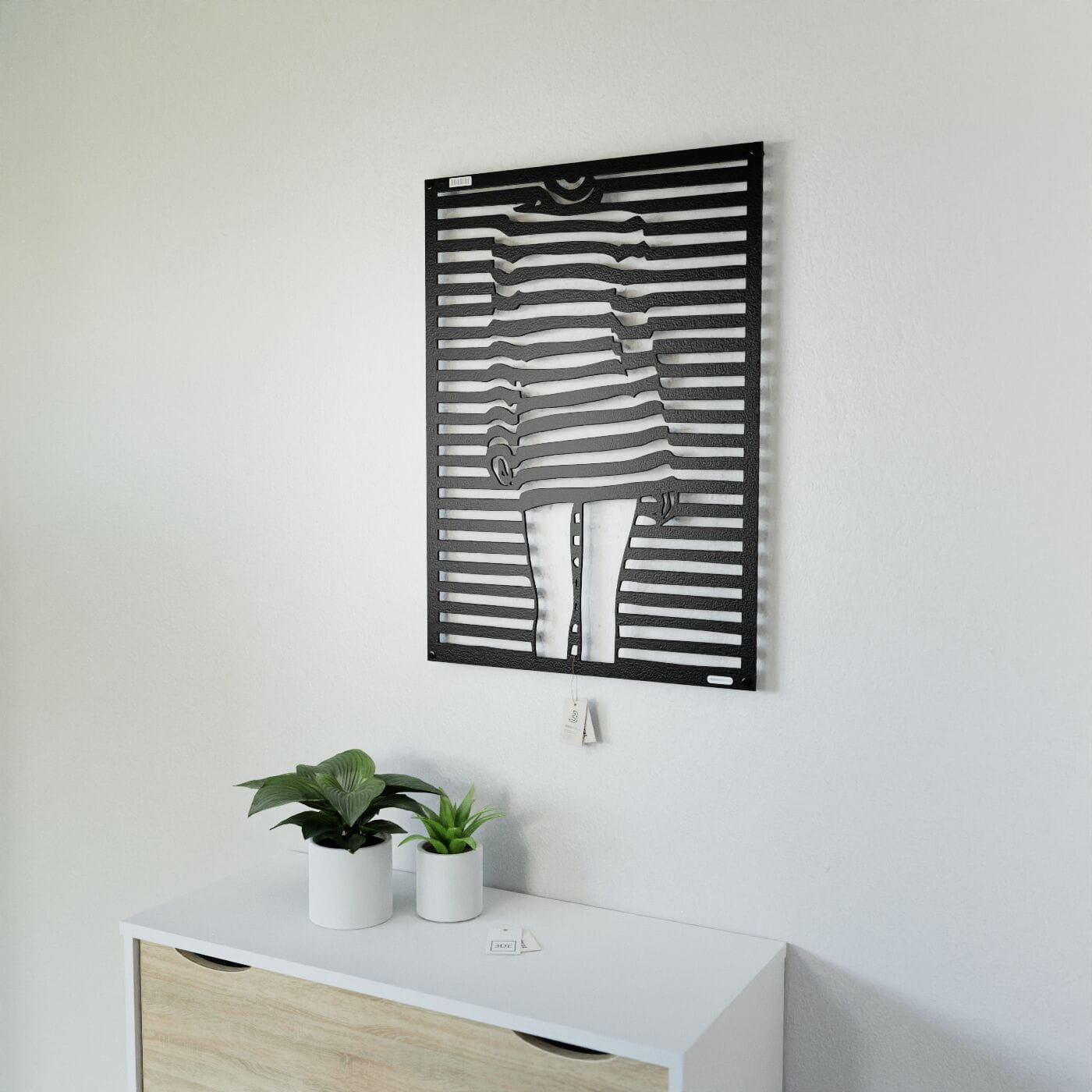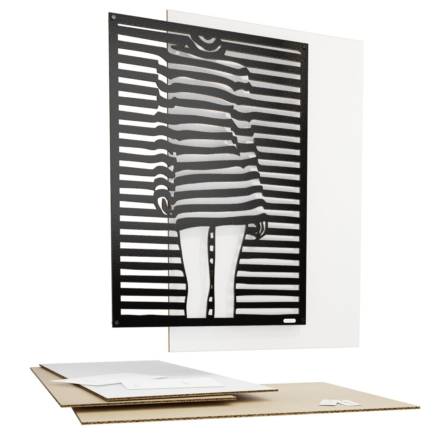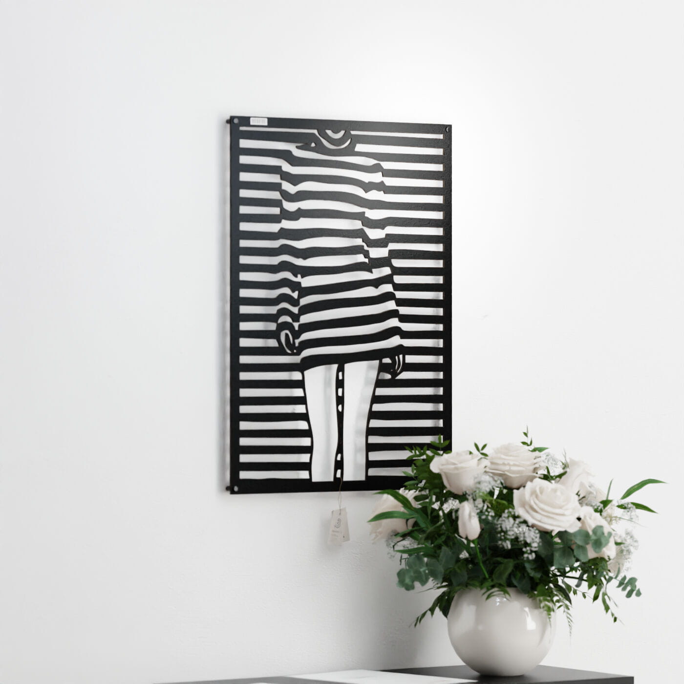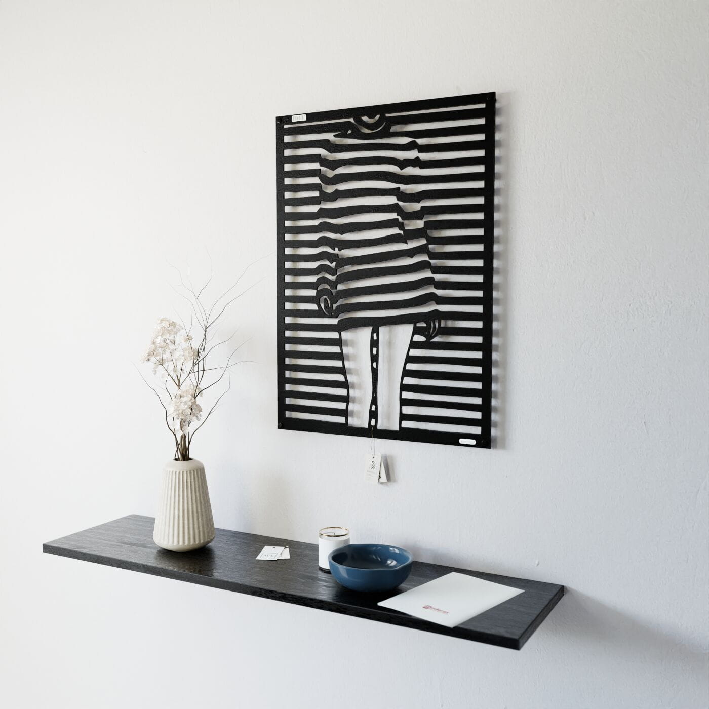 Panel dekoracyjny kobieta w pasyPanel dekoracyjny 3d "Kobieta w pasy" to nowoczesna ozdoba ścienna, która przyciąga wzrok nietypowym, dynamicznym wzorem. Kompozycja przedstawia postać kobiety ubranej w sukienkę w czarno-białe poziome pasy, które doskonale komponują się z tłem, tworząc iluzję ruchu i głębi. Zastosowanie takiego motywu dodaje projektowi unikalnego charakteru, a zarazem zachowuje jego minimalistyczną estetykę. Ta dekoracja ażurowa zaskakuje swoją prostotą, ale jednocześnie intryguje. Równomierne pasy przeplatają się, nadając całości lekkiego i nowoczesnego wyglądu. Wzór doskonale wpasuje się w przestrzenie urządzone w stylu industrialnym, nowoczesnym lub loftowym, wprowadzając do wnętrza świeży akcent. Panel ścienny "Kobieta w pasy" to idealny wybór dla osób, które cenią sobie nietuzinkowe dekoracje i chcą dodać odrobinę artystycznej dynamiki do swojego wnętrza.
