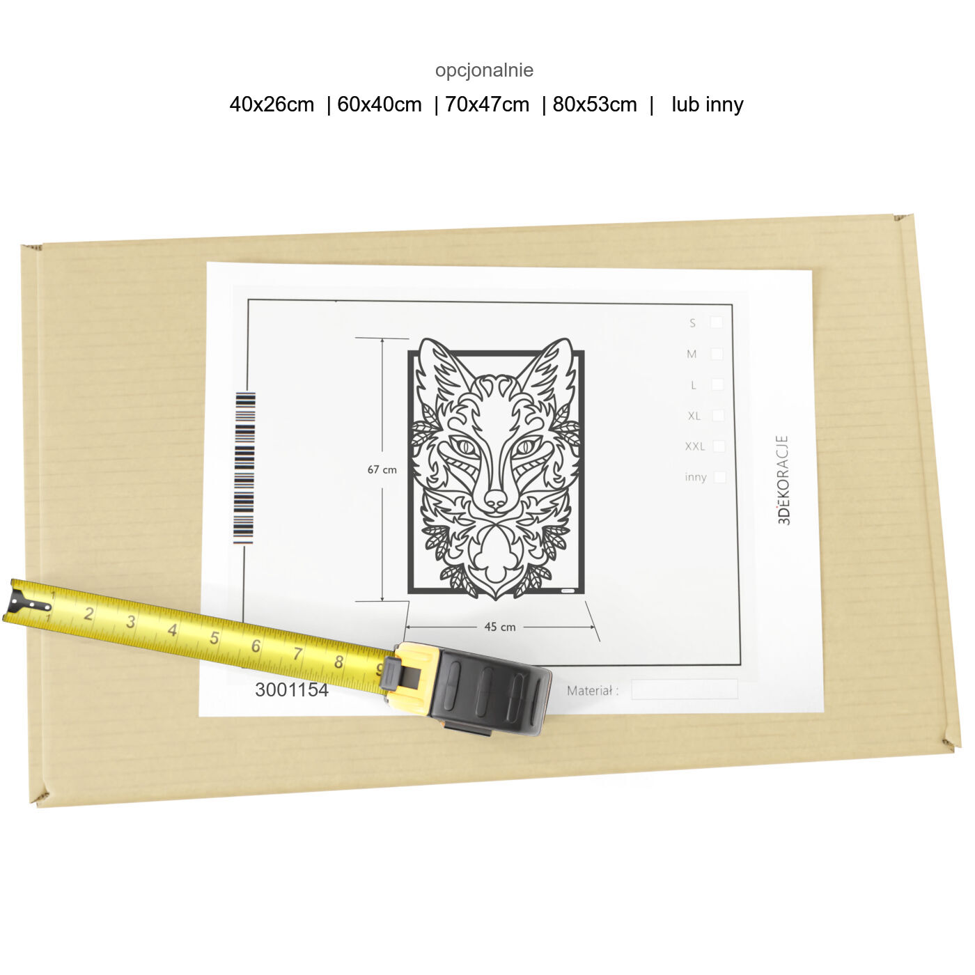 Panel ażurowy lisPanel dekoracyjny "Lis" to fascynująca ozdoba na ścianę, która wnosi do wnętrza unikalny, dziki klimat. Ażurowy motyw lisa, ukazany w precyzyjnie wykonanym wzorze, tworzy nietuzinkową dekorację, która przyciąga wzrok swoją oryginalnością. Ta dekoracja ażurowa znakomicie sprawdzi się zarówno w nowoczesnych, jak i klasycznych aranżacjach. Dzięki misternej formie oraz inspiracji naturą, panel idealnie nadaje się do wnętrz, które cenią subtelność i styl. Wzór lisa dodaje charakteru i naturalnego piękna każdej przestrzeni, tworząc jednocześnie atmosferę bliskości z naturą. Wybierając ten panel ścienny, zyskujesz nie tylko wyjątkową ozdobę, ale i efektowny element aranżacji, który doskonale komponuje się z innymi dekoracjami. Idealny do salonu, sypialni lub gabinetu, wprowadza harmonię i oryginalność.