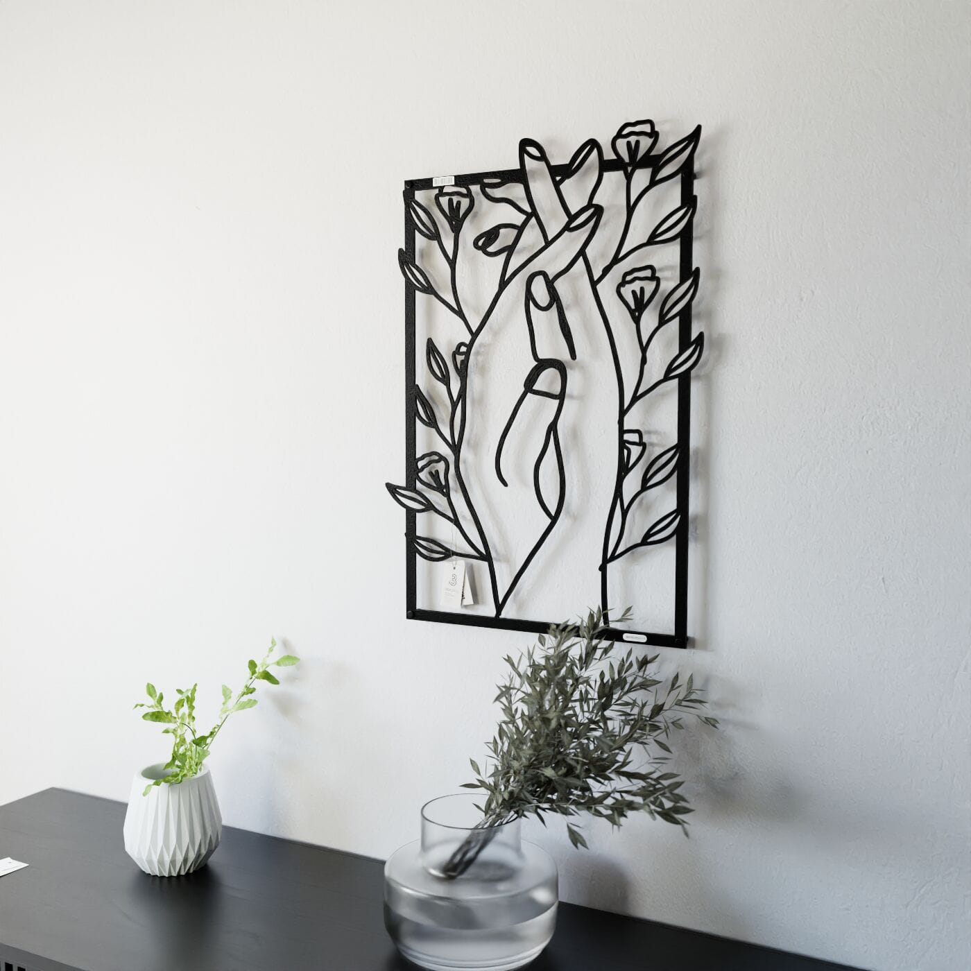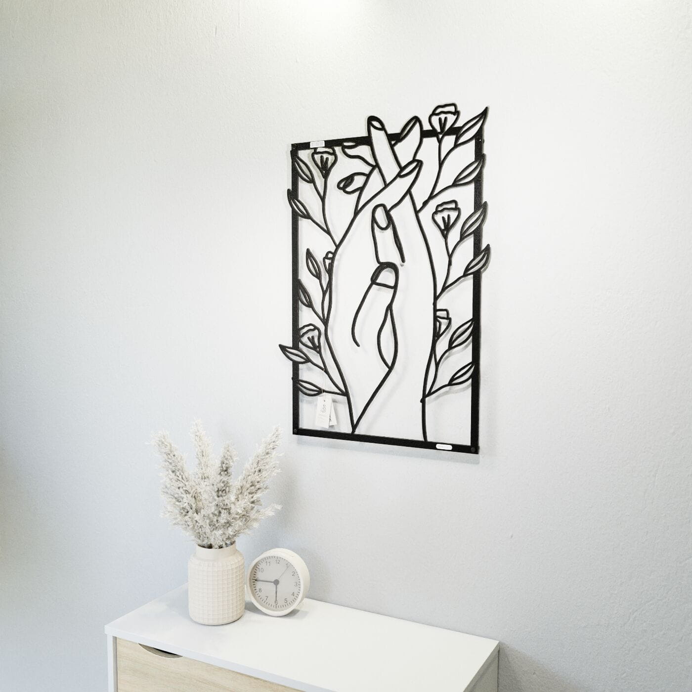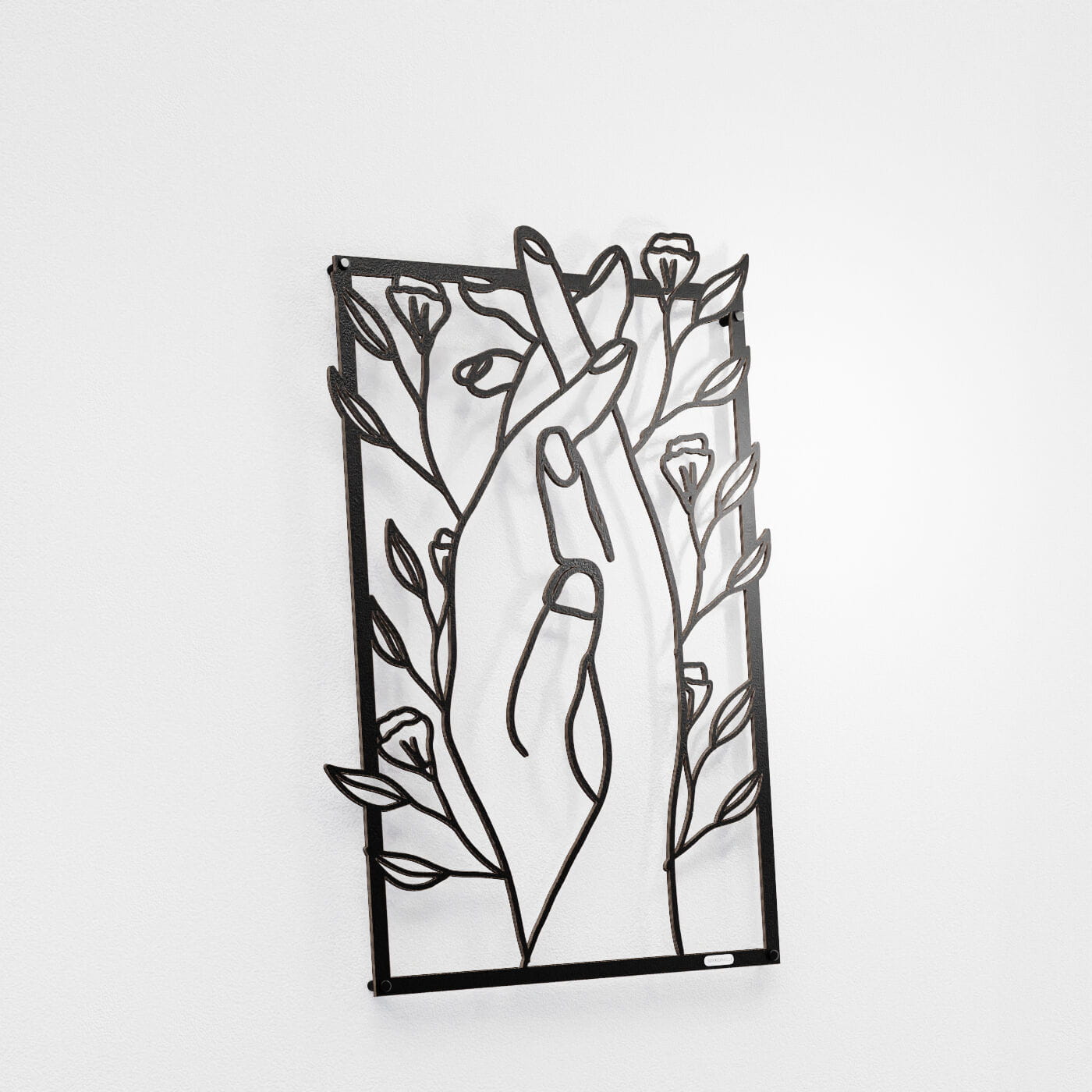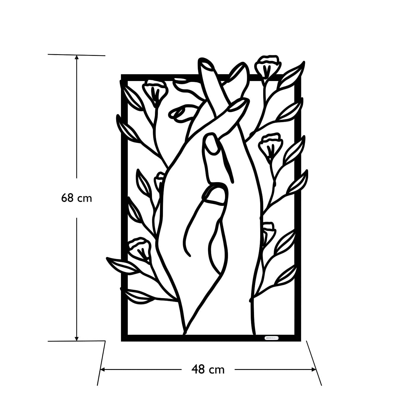 Panel dekoracyjny splecione dłoniePanel dekoracyjny "Splecione dłonie" to subtelna i poetycka ozdoba na ścianę, która łączy w sobie symbolikę bliskości i natury. Delikatnie splecione dłonie, otoczone drobnymi kwiatami, tworzą obraz pełen harmonii i spokoju, który doskonale oddaje uczucie wzajemnej więzi i przywiązania. Ten panel ścienny wykonany z precyzyjnie wyciętego materiału w czerni, stanowi idealny kontrast z jasnym tłem, dodając wnętrzu lekkości i elegancji. Dekoracja wyróżnia się nowoczesnym stylem, który łączy minimalistyczną formę z delikatnym akcentem natury. Dzięki swojej lekkości, panel ten jest łatwy w montażu, a jego efektowny wygląd tworzy ciekawą grę światła i cienia na ścianie, co dodaje przestrzeni głębi. Ozdoba ścienna "Splecione dłonie" idealnie sprawdzi się w sypialni, salonie, czy kąciku do medytacji, wprowadzając do wnętrza atmosferę wyciszenia i intymności. Może również stanowić elegancki dodatek do przestrzeni o bardziej artystycznym charakterze, gdzie każdy detal ma znaczenie.