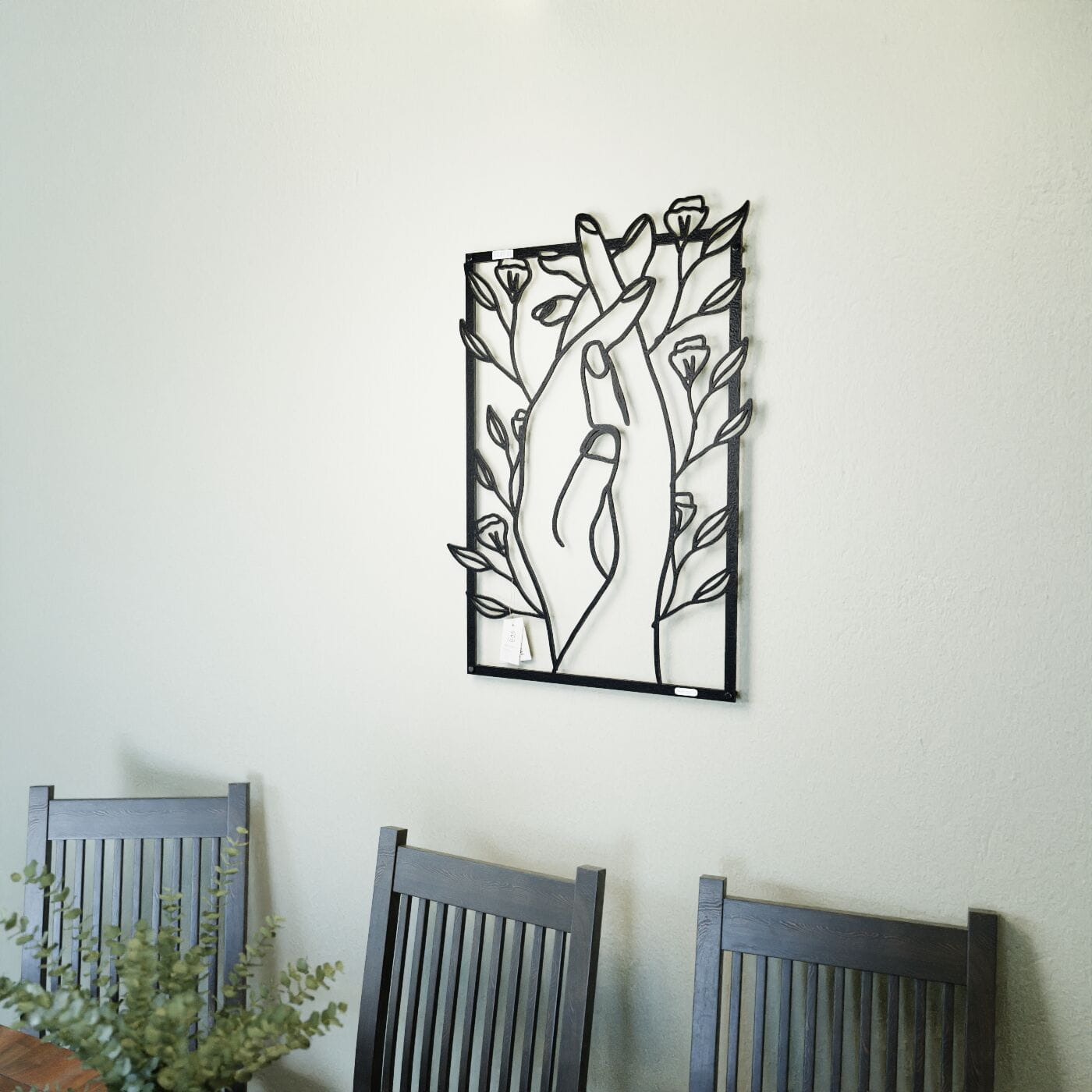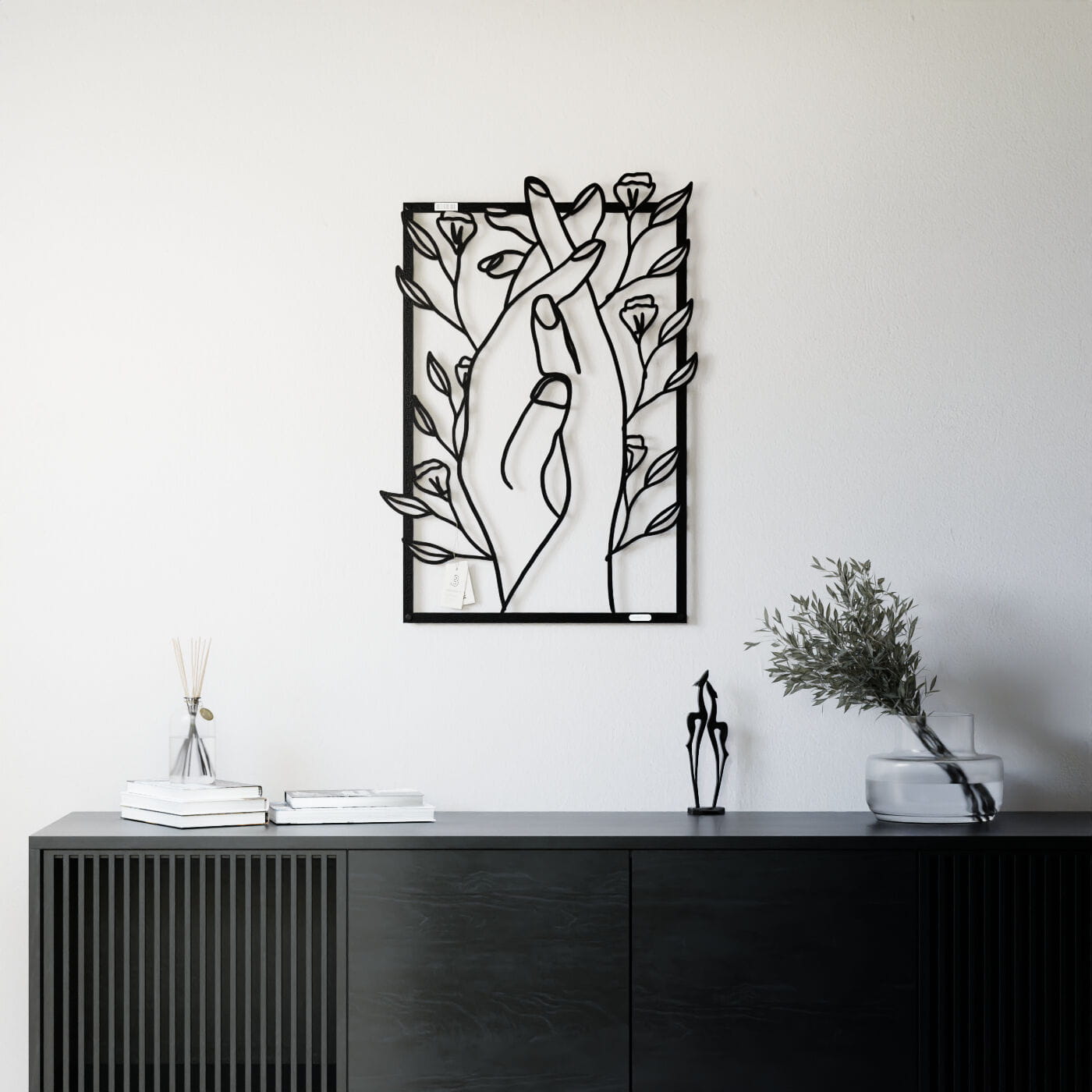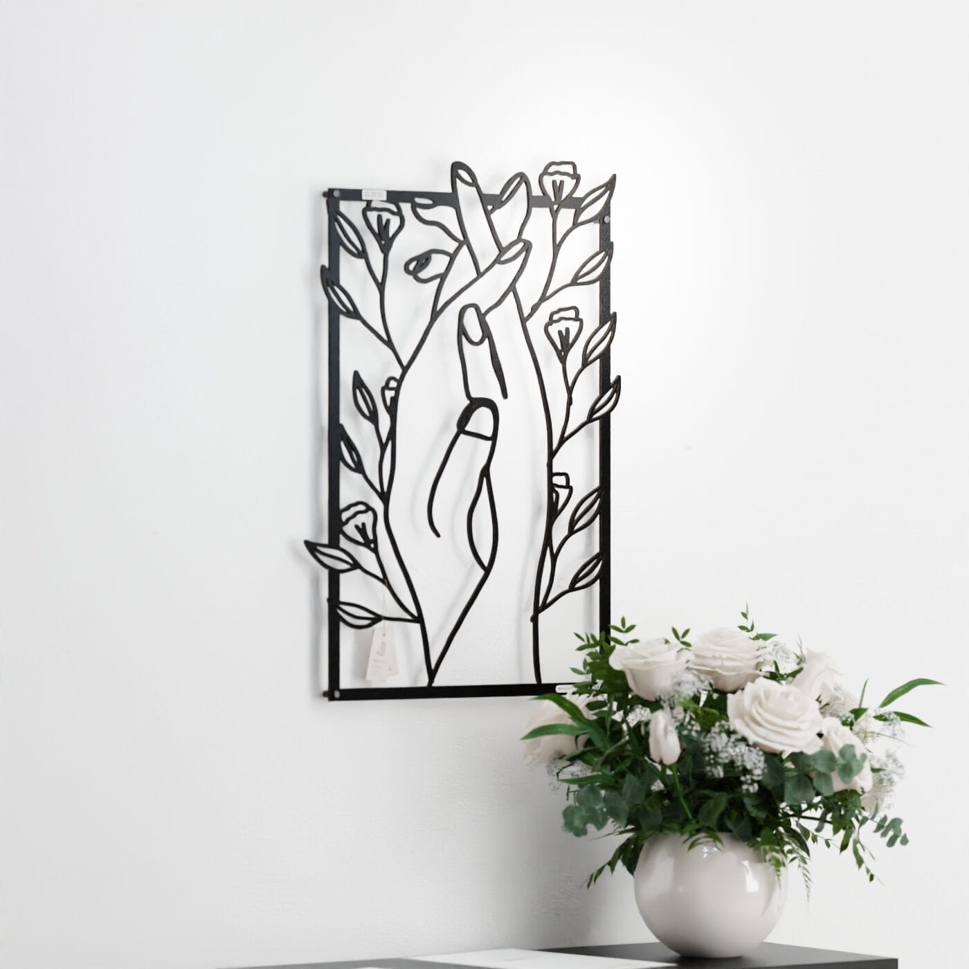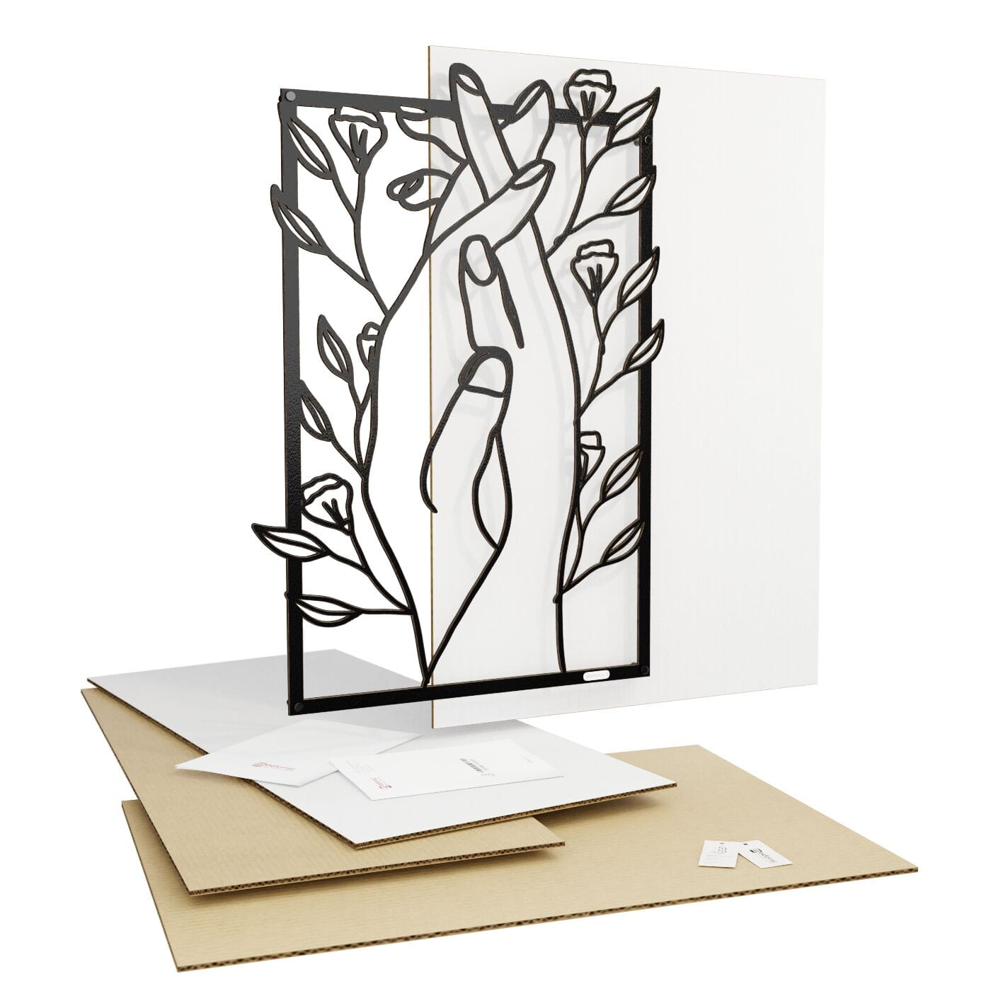 Panel dekoracyjny splecione dłoniePanel dekoracyjny "Splecione dłonie" to subtelna i poetycka ozdoba na ścianę, która łączy w sobie symbolikę bliskości i natury. Delikatnie splecione dłonie, otoczone drobnymi kwiatami, tworzą obraz pełen harmonii i spokoju, który doskonale oddaje uczucie wzajemnej więzi i przywiązania. Ten panel ścienny wykonany z precyzyjnie wyciętego materiału w czerni, stanowi idealny kontrast z jasnym tłem, dodając wnętrzu lekkości i elegancji. Dekoracja wyróżnia się nowoczesnym stylem, który łączy minimalistyczną formę z delikatnym akcentem natury. Dzięki swojej lekkości, panel ten jest łatwy w montażu, a jego efektowny wygląd tworzy ciekawą grę światła i cienia na ścianie, co dodaje przestrzeni głębi. Ozdoba ścienna "Splecione dłonie" idealnie sprawdzi się w sypialni, salonie, czy kąciku do medytacji, wprowadzając do wnętrza atmosferę wyciszenia i intymności. Może również stanowić elegancki dodatek do przestrzeni o bardziej artystycznym charakterze, gdzie każdy detal ma znaczenie.