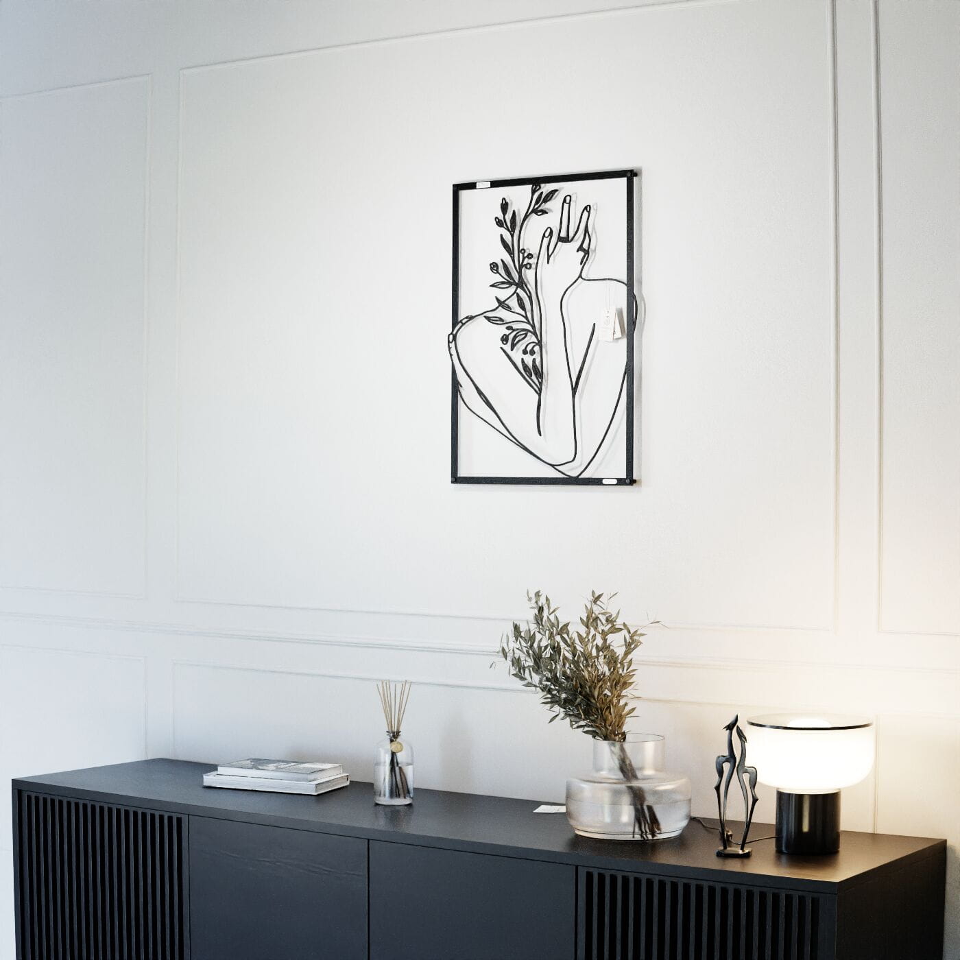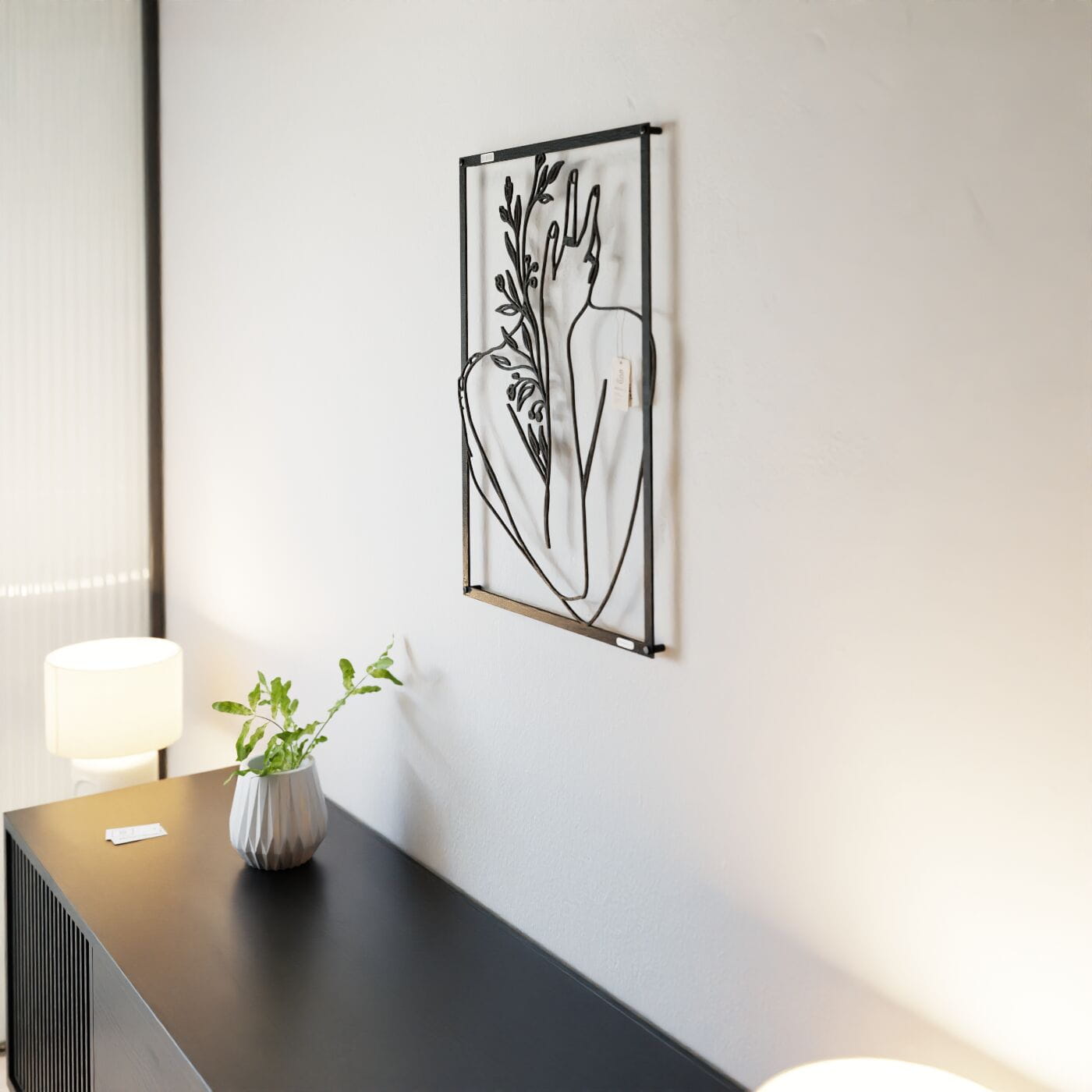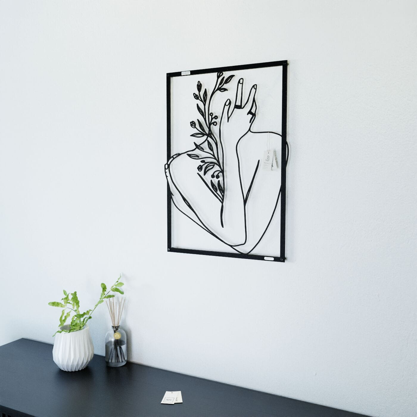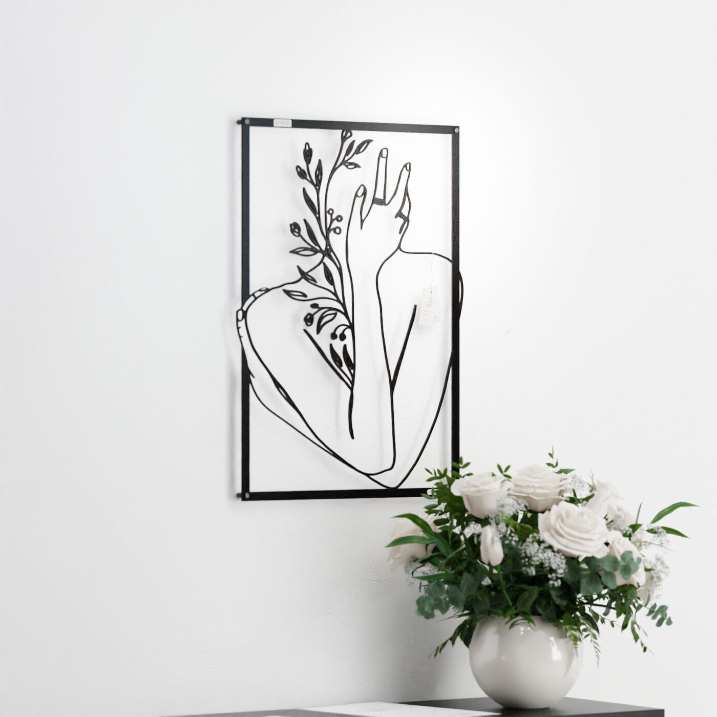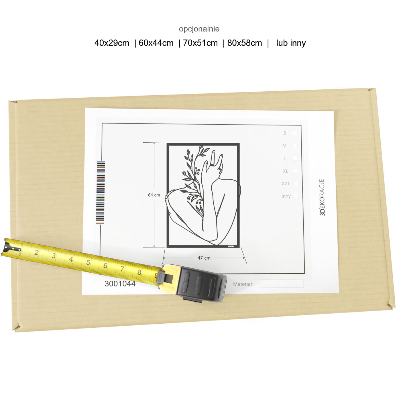 Panel dekoracyjny ręka na twarzyDekoracja ażurowa "Ręka na twarzy" to artystyczny panel ścienny, który łączy w sobie elegancję i delikatność ludzkiego ciała z motywami natury. Przedstawiający postać z ręką delikatnie podtrzymującą twarz, otoczoną subtelnymi gałązkami i liśćmi, panel ten jest wyrazem harmonii i spokoju. Precyzyjnie wycięte laserowo linie podkreślają każdy szczegół – od smukłości dłoni po detale roślin, nadając całości głęboki i przestrzenny efekt. Ozdoba na ścianę wyróżnia się minimalistycznym designem, który świetnie komponuje się z nowoczesnymi wnętrzami. Panel doskonale wpasuje się w salonie, sypialni czy gabinecie, nadając pomieszczeniu subtelnego, ale wyrazistego charakteru. Cienie rzucane przez dekorację pod wpływem światła tworzą dodatkowy efekt trójwymiarowości, wzbogacając aranżację wnętrza o głębię i lekkość. Ta dekoracja ścienna to idealne rozwiązanie dla osób, które szukają nietuzinkowego akcentu w swoim wnętrzu, łączącego w sobie elementy sztuki i natury. Dzięki lekkiej konstrukcji jest łatwa w montażu i może szybko odmienić atmosferę wnętrza, wprowadzając elegancki i artystyczny akcent.