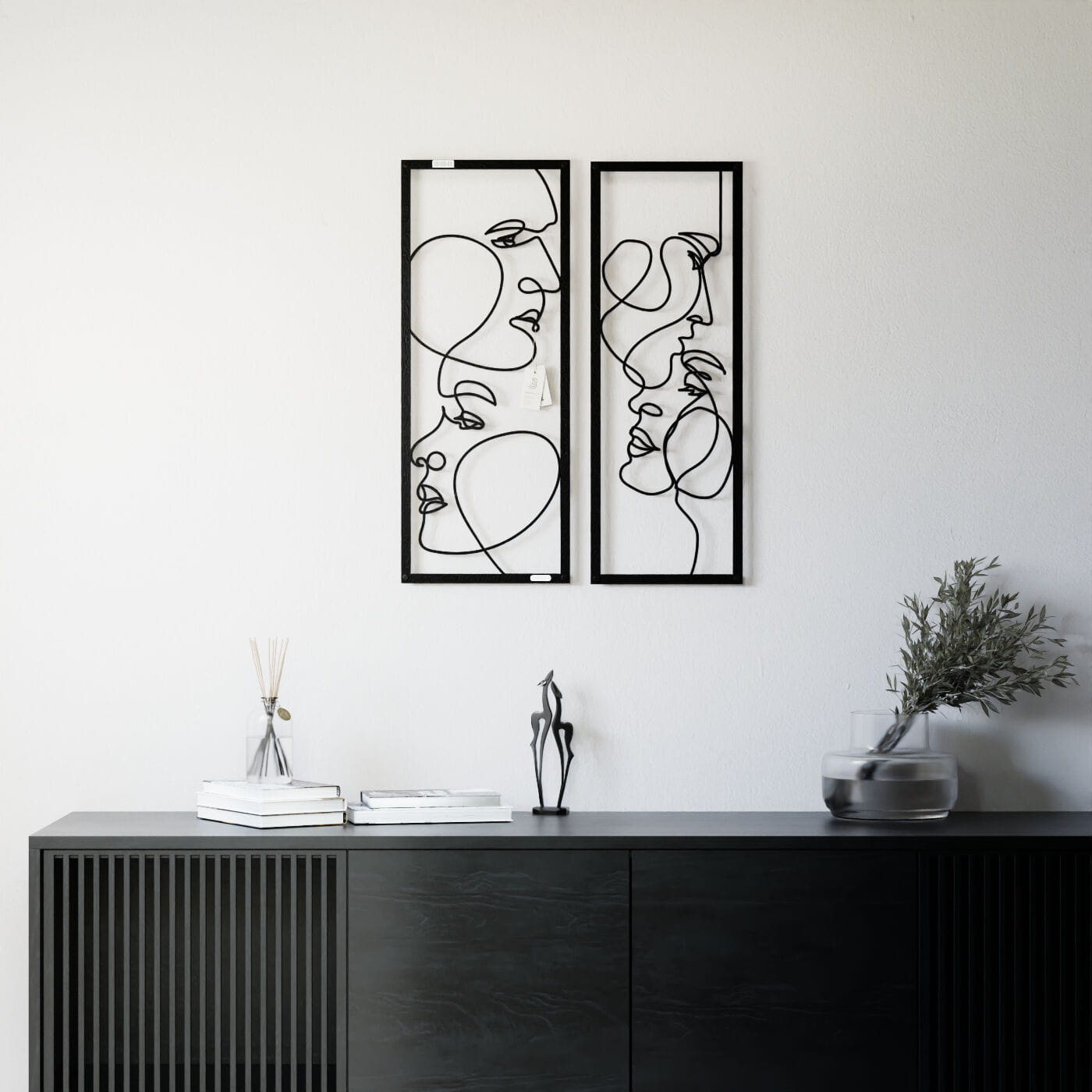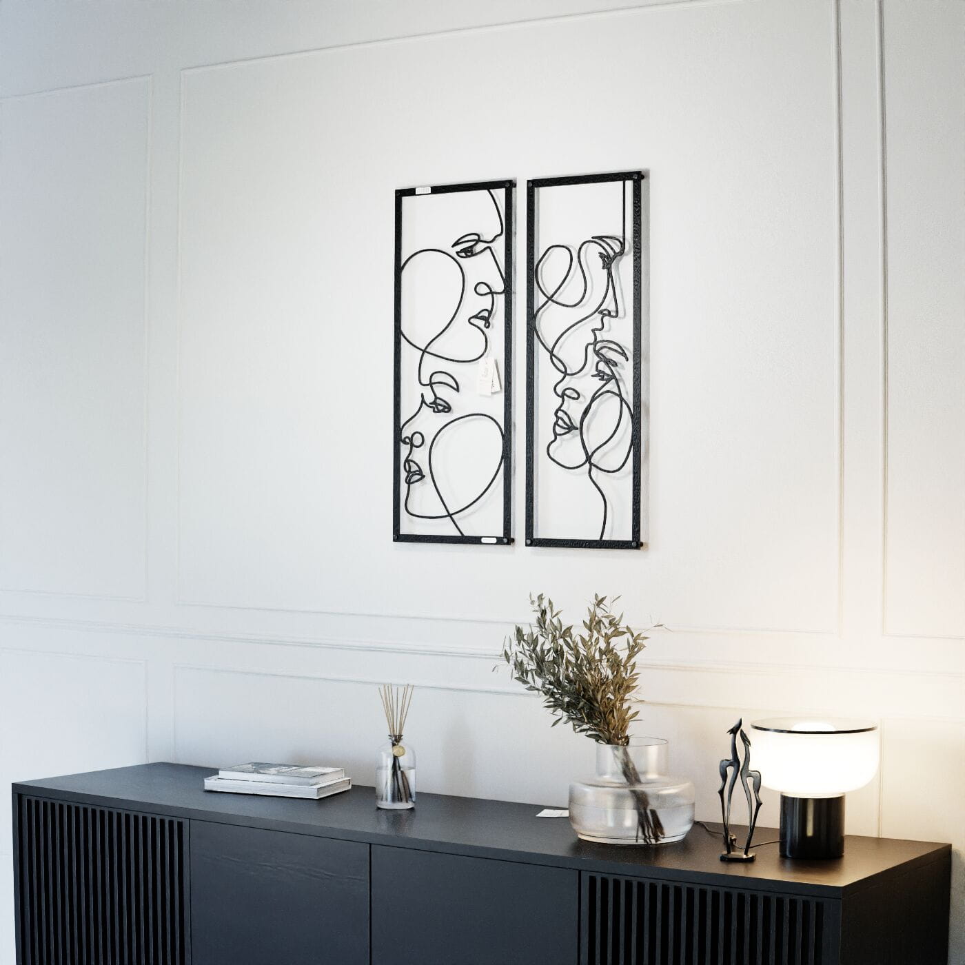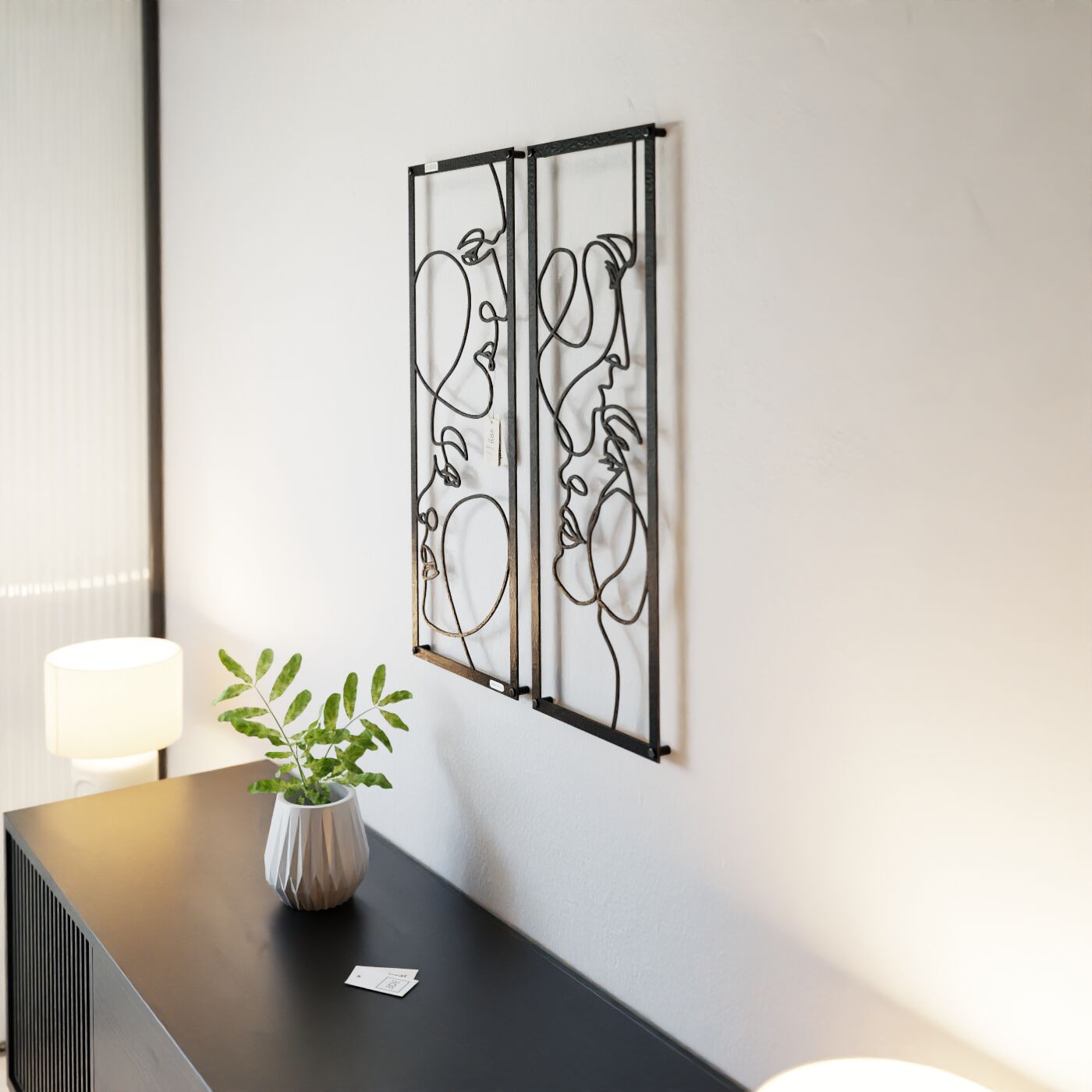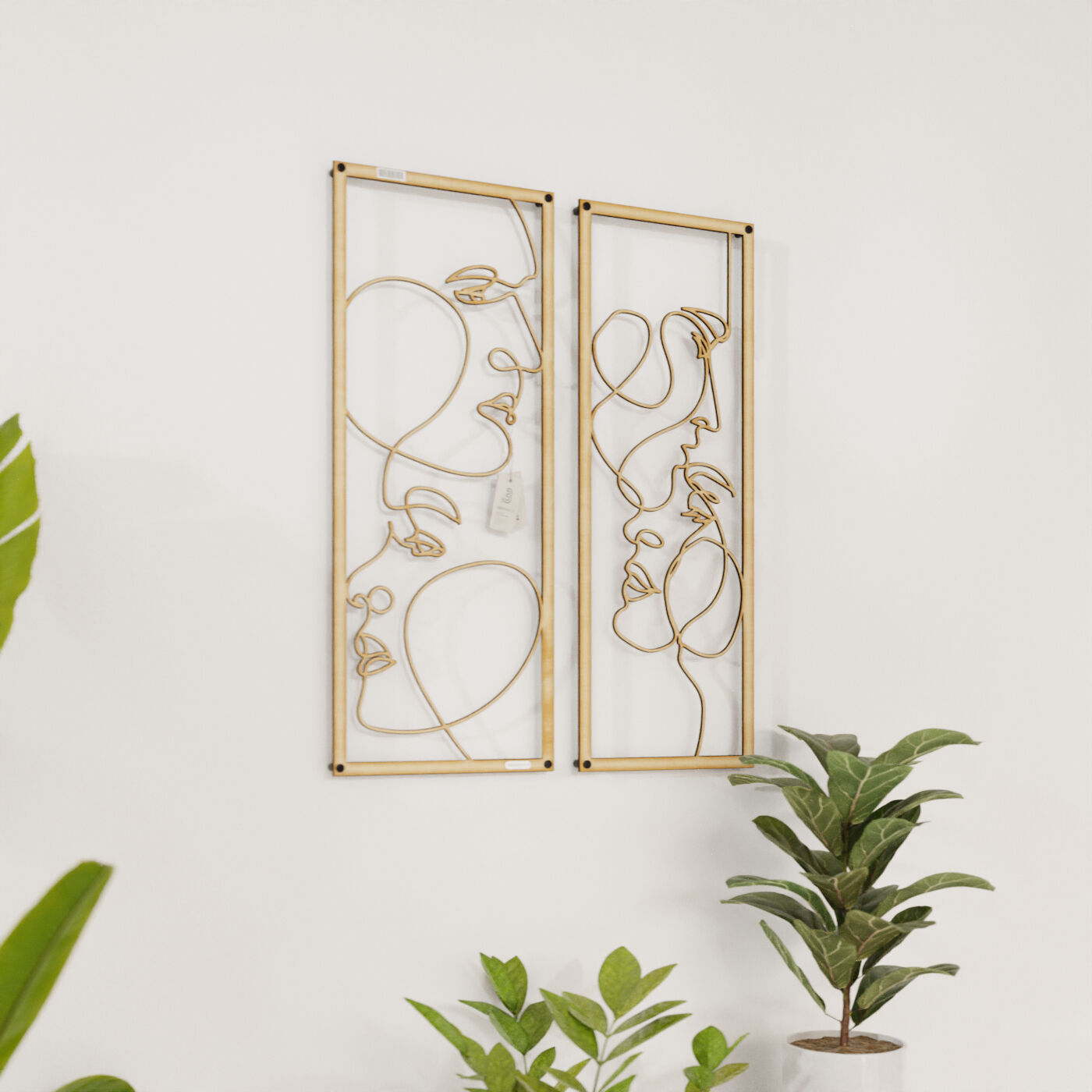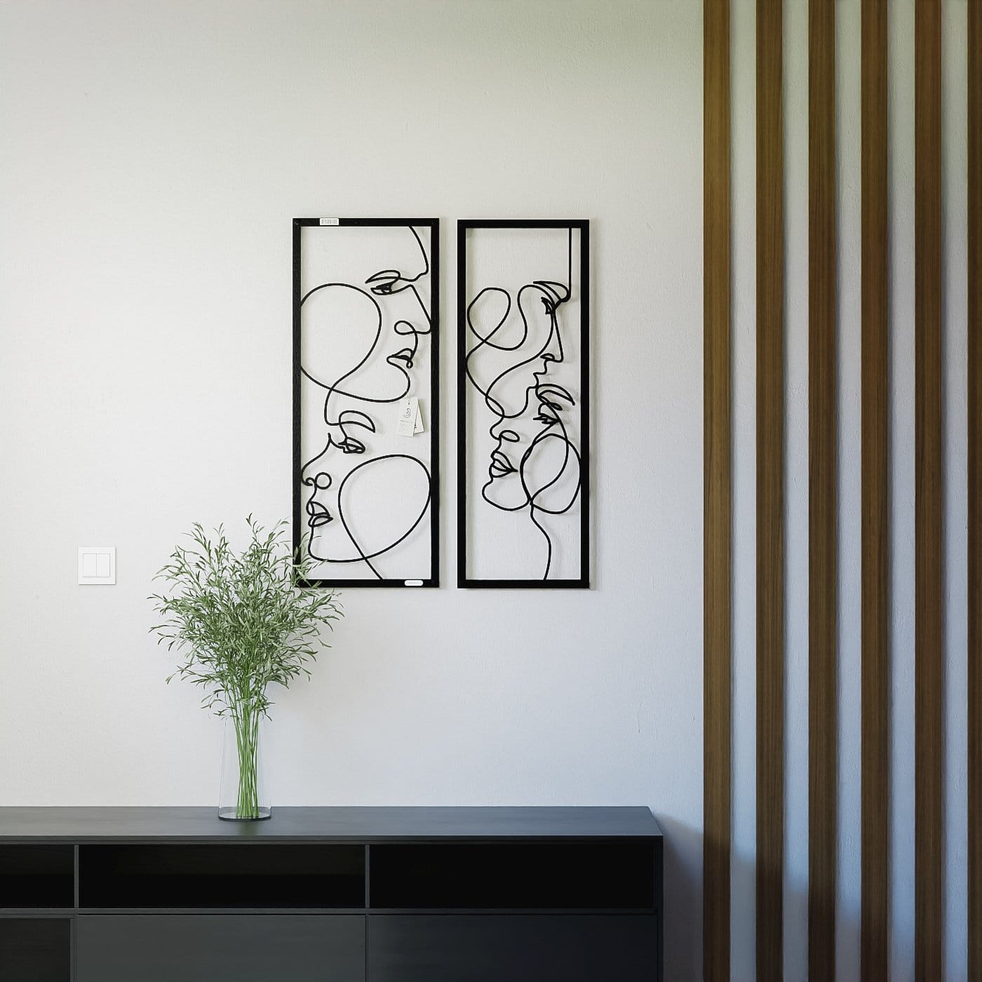 Dyptyk ażurowy zakochaniDwa panele ażurowe 3d "Zakochani" to wyjątkowa i artystyczna dekoracja ścienna, która idealnie wpasuje się w nowoczesne wnętrza. Zestaw składa się z dwóch paneli, z których każdy przedstawia abstrakcyjne, ale subtelnie zarysowane twarze, wycięte jednym ciągłym ruchem linii. Twarze zwrócone ku sobie, delikatnie przenikające się, oddają intymność i bliskość, nadając całości romantyczny charakter. Te panele dekoracyjne wyróżniają się minimalistycznym, a jednocześnie wyrazistym stylem. Cienkie, czarne linie, starannie wycięte laserowo z drewna, tworzą elegancki kontrast z jasnym tłem, a naturalne światło, które pada na panele, wzbogaca je o ciekawe cienie, tworząc efekt głębi. Ozdoba na ścianę "Zakochani" doskonale sprawdzi się w sypialni, salonie lub przestrzeni, gdzie potrzebny jest romantyczny akcent. Dzięki lekkości formy, panele są łatwe w montażu, a ich oryginalna stylistyka wprowadzi do wnętrza element sztuki i emocji, przyciągając wzrok każdego, kto je zobaczy.