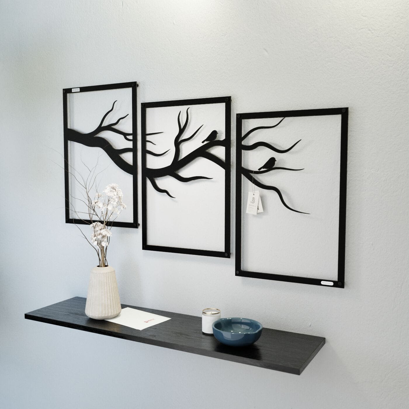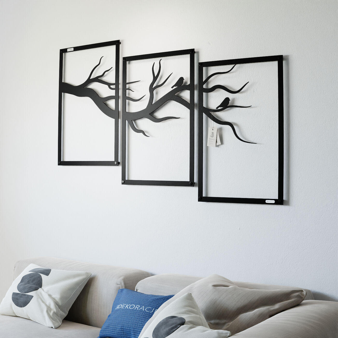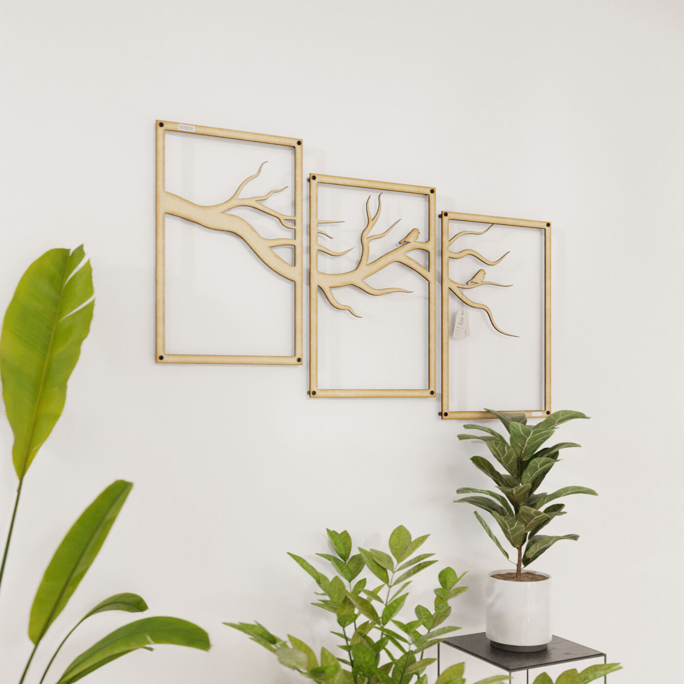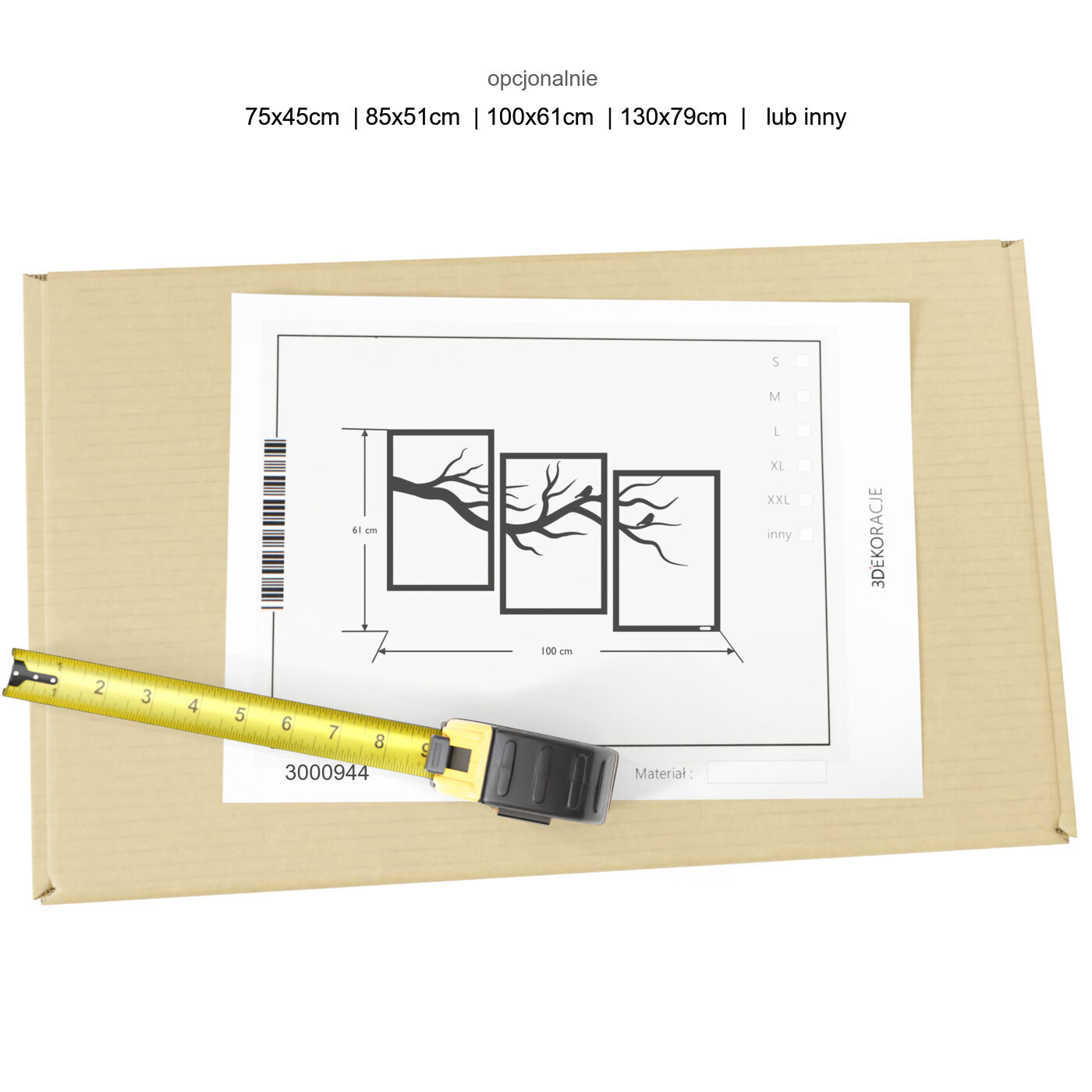 Panele ażurowe 3d tryptyk drzewoPanel ażurowy 3D - Tryptyk z gałęziami drzewa i ptakami to wyjątkowa ozdoba ścienna, która w subtelny sposób łączy naturalne motywy z geometrycznym układem. Przedstawione na trzech panelach gałęzie drzewa, na których przysiadły dwa ptaki, tworzą harmonijną kompozycję, wprowadzającą atmosferę spokoju i bliskości natury. Każdy szczegół tej dekoracji został precyzyjnie wycięty, tworząc wyrazistą formę, która doskonale komponuje się z nowoczesnym wnętrzem. Ten panel ścienny świetnie pasuje do salonu w stylu minimalistycznym, sypialni w stylu skandynawskim lub przytulnego domowego biura. Jego organiczny charakter będzie także odpowiedni do przestrzeni inspirowanych stylem eko lub japandi, gdzie prostota idzie w parze z naturalnymi akcentami. Może być umieszczony nad sofą, biurkiem czy w przedpokoju, dodając wnętrzu przytulności. Wykonany z drewna, w wersji ze sklejki lub płyty laminowanej, panel ten jest lekki i łatwy w montażu. Dzięki zastosowaniu dystansów montażowych, cała konstrukcja subtelnie odstaje od ściany, tworząc efekt trójwymiarowości i nadając wnętrzu nowoczesnego charakteru.