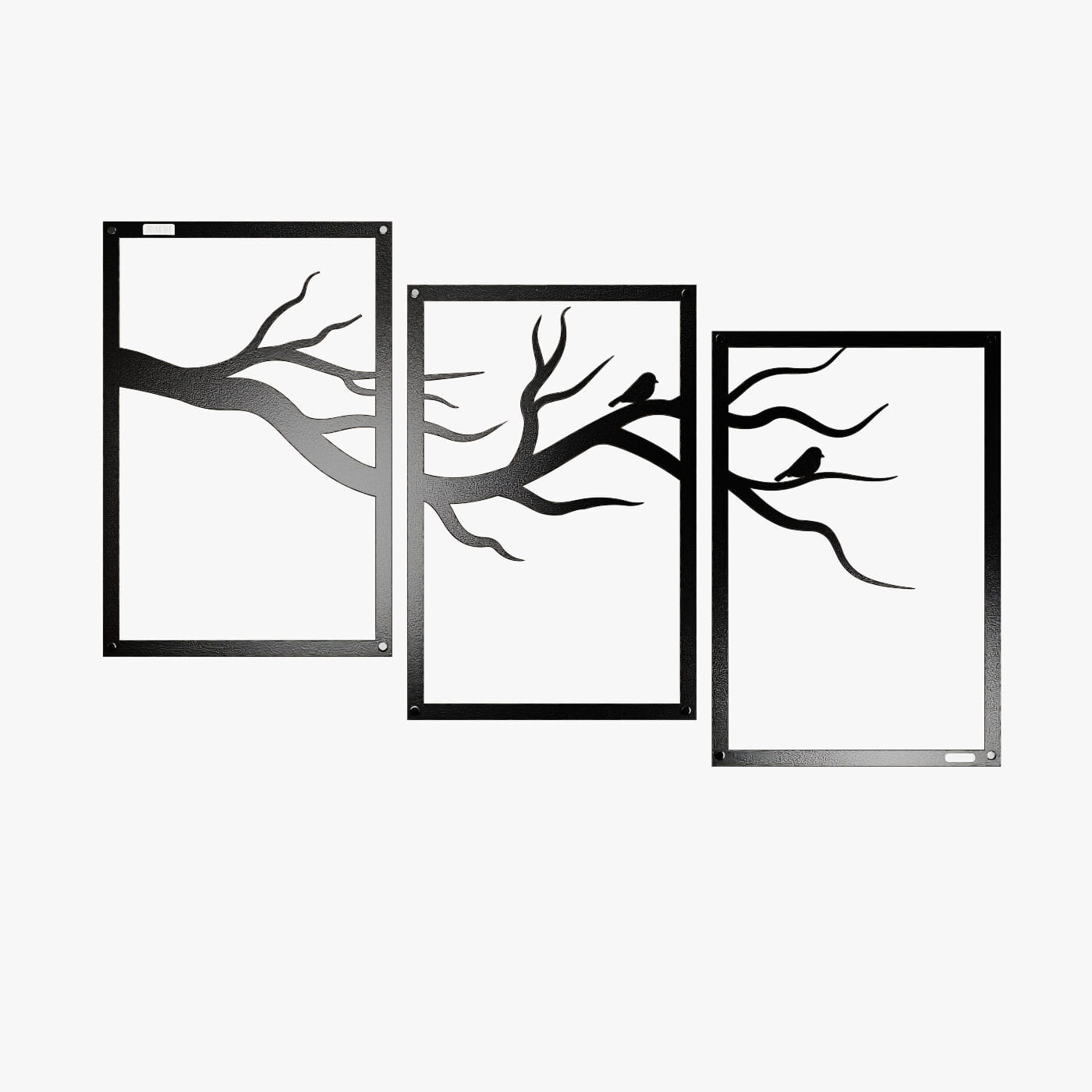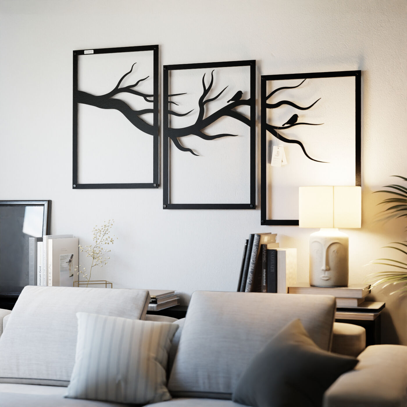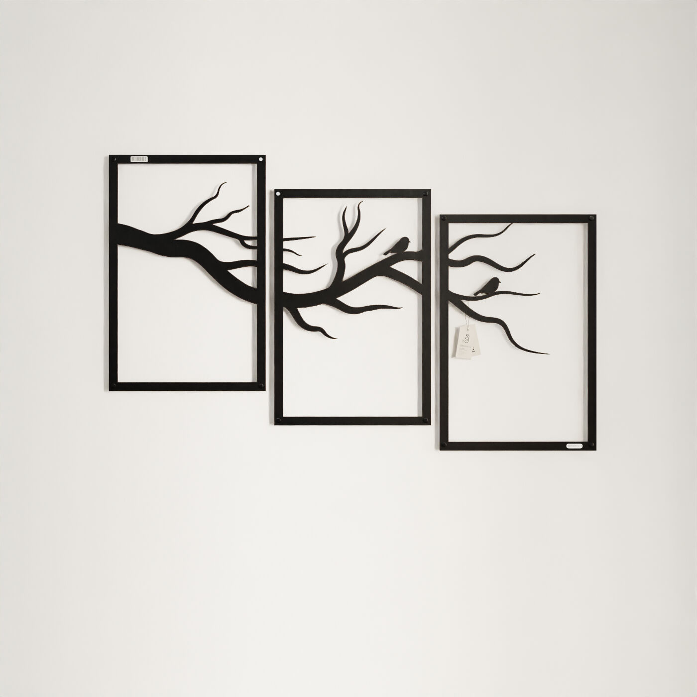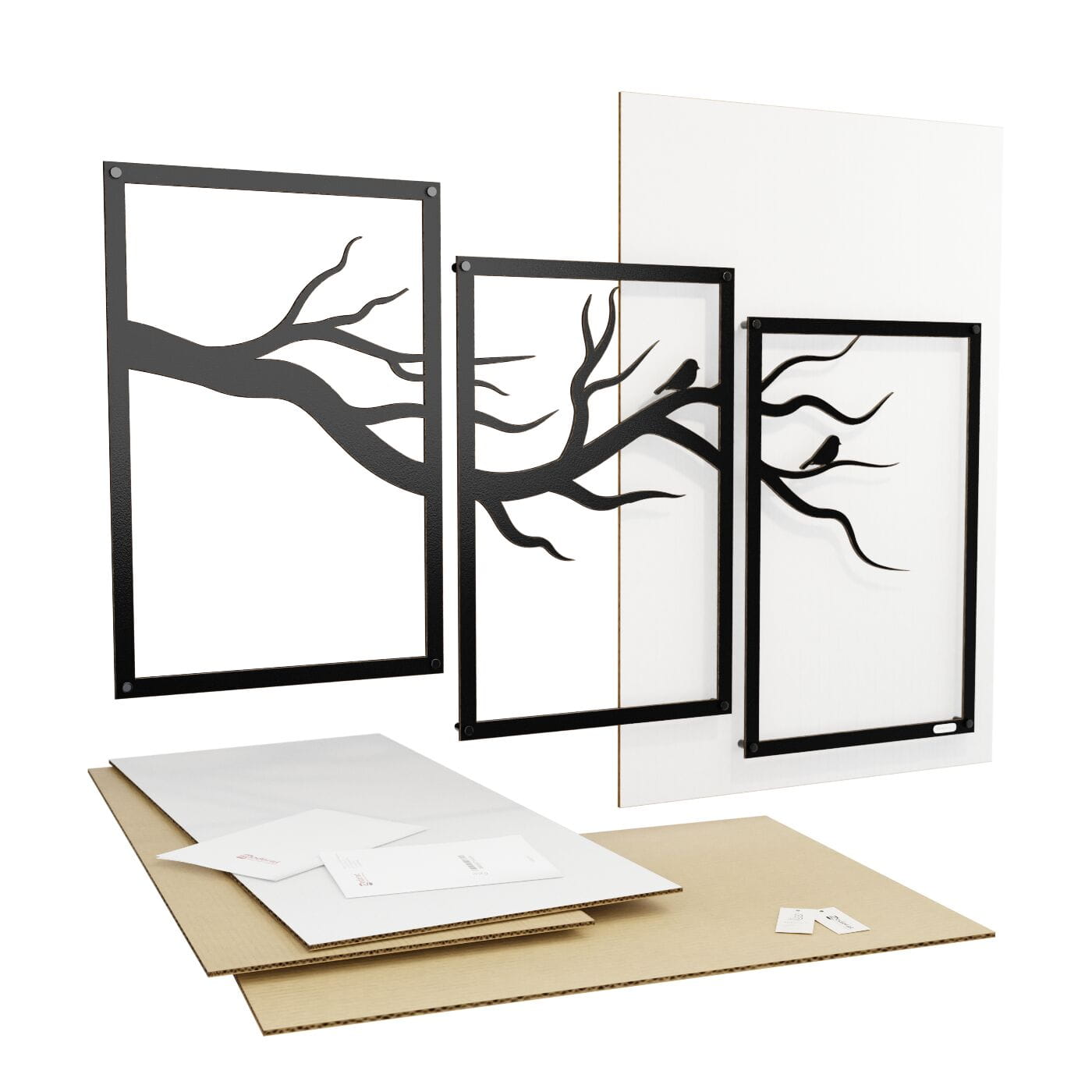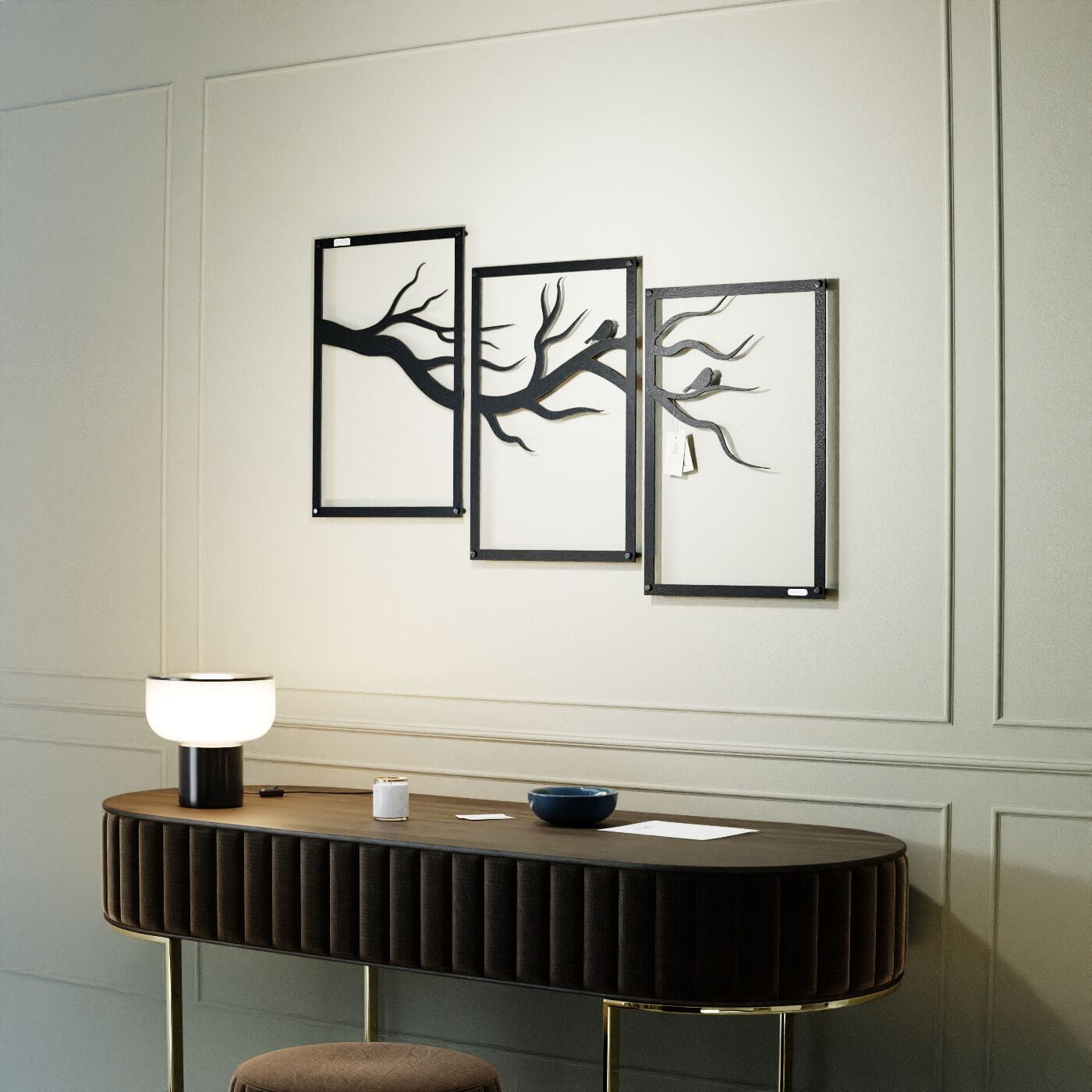 Panele ażurowe 3d tryptyk drzewoPanel ażurowy 3D - Tryptyk z gałęziami drzewa i ptakami to wyjątkowa ozdoba ścienna, która w subtelny sposób łączy naturalne motywy z geometrycznym układem. Przedstawione na trzech panelach gałęzie drzewa, na których przysiadły dwa ptaki, tworzą harmonijną kompozycję, wprowadzającą atmosferę spokoju i bliskości natury. Każdy szczegół tej dekoracji został precyzyjnie wycięty, tworząc wyrazistą formę, która doskonale komponuje się z nowoczesnym wnętrzem. Ten panel ścienny świetnie pasuje do salonu w stylu minimalistycznym, sypialni w stylu skandynawskim lub przytulnego domowego biura. Jego organiczny charakter będzie także odpowiedni do przestrzeni inspirowanych stylem eko lub japandi, gdzie prostota idzie w parze z naturalnymi akcentami. Może być umieszczony nad sofą, biurkiem czy w przedpokoju, dodając wnętrzu przytulności. Wykonany z drewna, w wersji ze sklejki lub płyty laminowanej, panel ten jest lekki i łatwy w montażu. Dzięki zastosowaniu dystansów montażowych, cała konstrukcja subtelnie odstaje od ściany, tworząc efekt trójwymiarowości i nadając wnętrzu nowoczesnego charakteru.