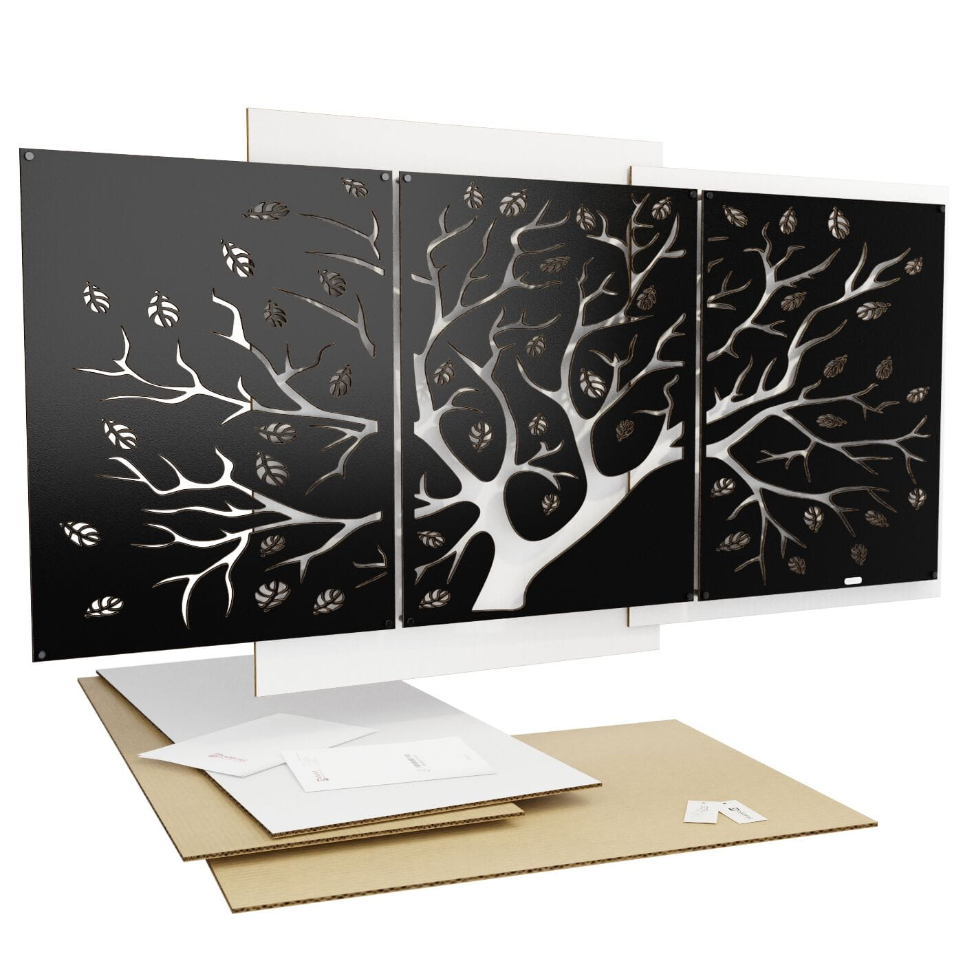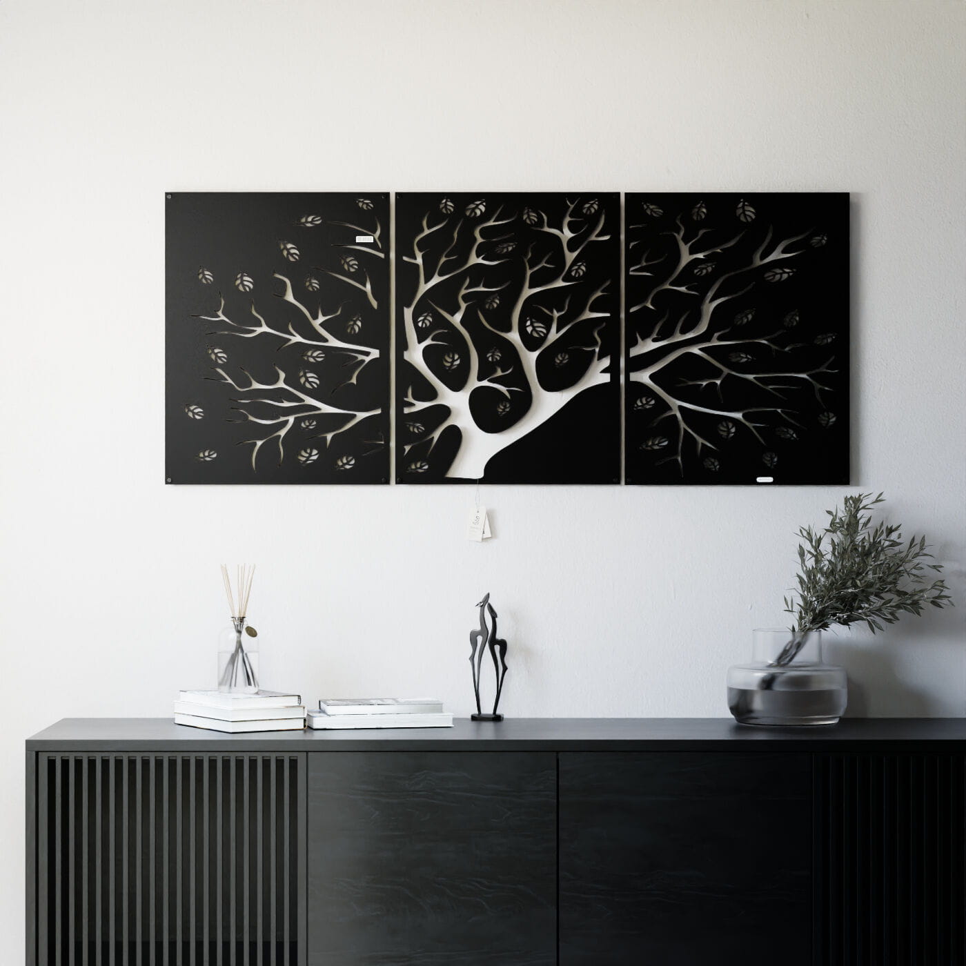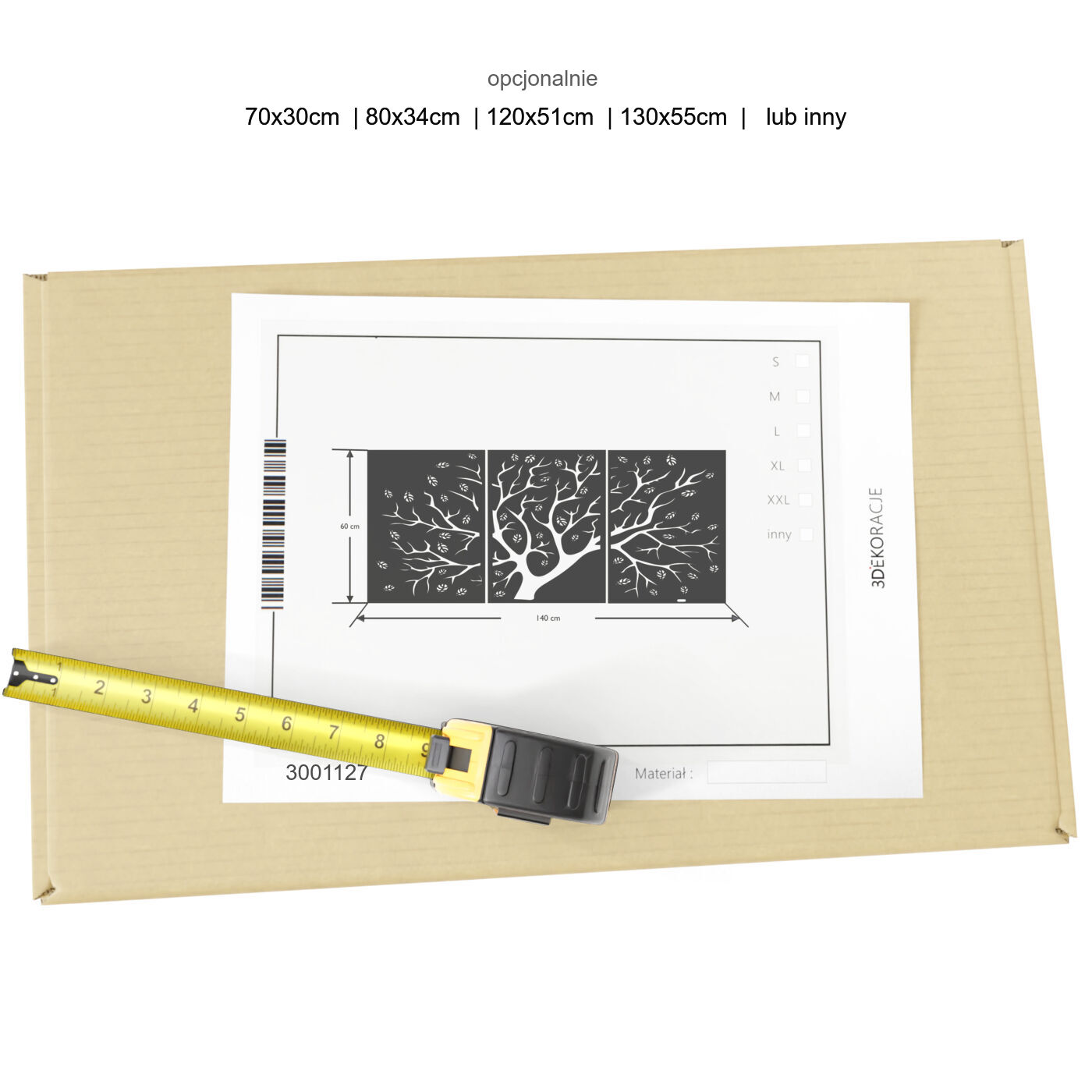 Tryptyk panele dekoracyjne drzewoTryptyk dekoracyjny z motywem drzewa to wyrazista ozdoba na ścianę, która zachwyca swoją prostotą i subtelnością natury. Trzy panele ukazują rozłożyste gałęzie drzewa, które rozciągają się w różnych kierunkach, tworząc spójną i dynamiczną kompozycję. Laserowo wycięte liście i gałęzie są delikatnie podkreślone kontrastem czerni i światła, co nadaje dekoracji wyjątkowy efekt trójwymiarowości. Ta dekoracja ażurowa doskonale wkomponuje się w nowoczesne wnętrza, nadając im naturalnego charakteru i elegancji. Czarne tło paneli podkreśla szczegółowość wyciętych elementów, a gra światła sprawia, że kompozycja ożywa, tworząc ciekawe cienie na ścianie. Ten panel dekoracyjny z motywem drzewa świetnie sprawdzi się w salonie, sypialni lub jadalni, wprowadzając do wnętrza spokój i harmonię. Dla miłośników natury i minimalistycznych wzorów, ten tryptyk to doskonały wybór, który nada wnętrzu stylu i unikalnego charakteru.