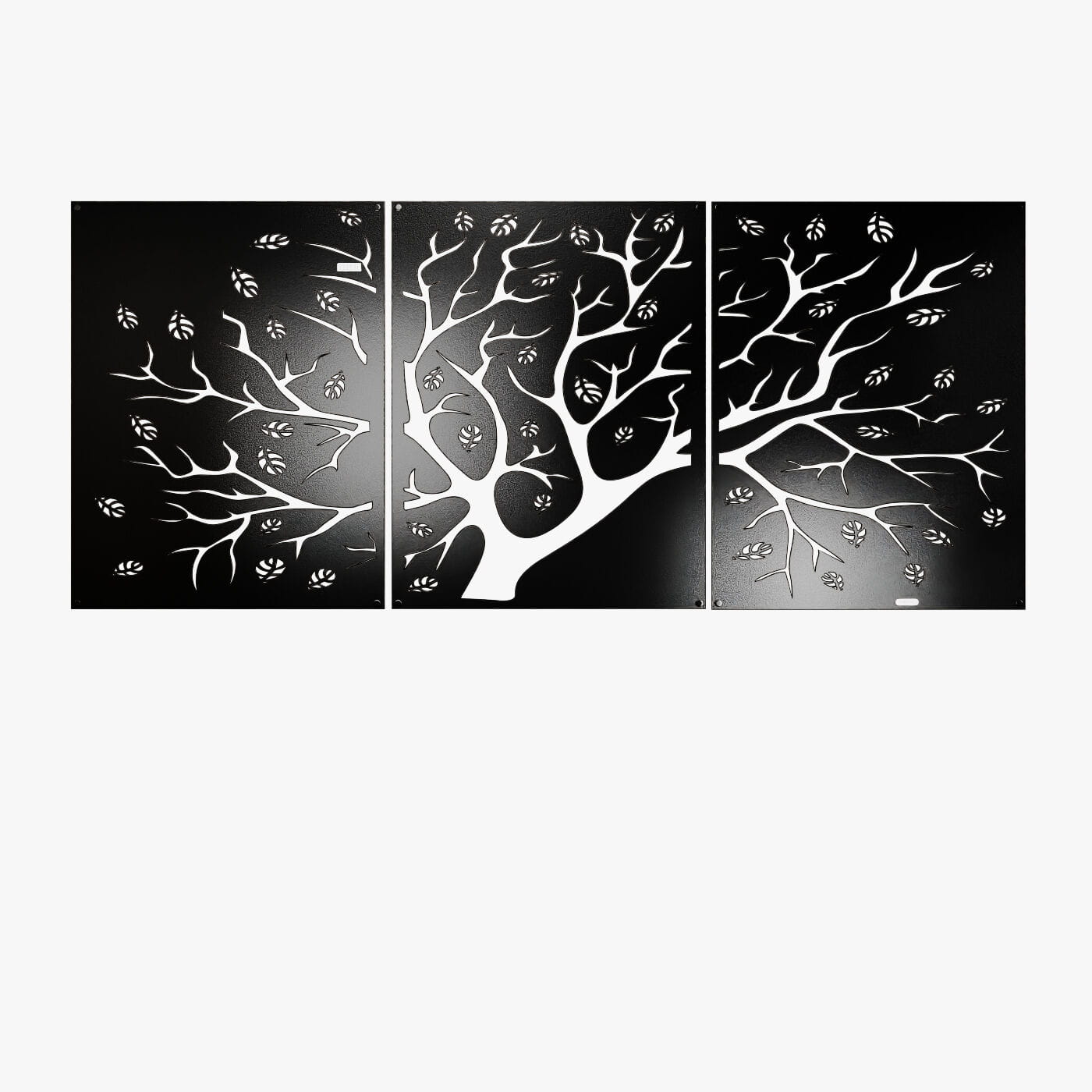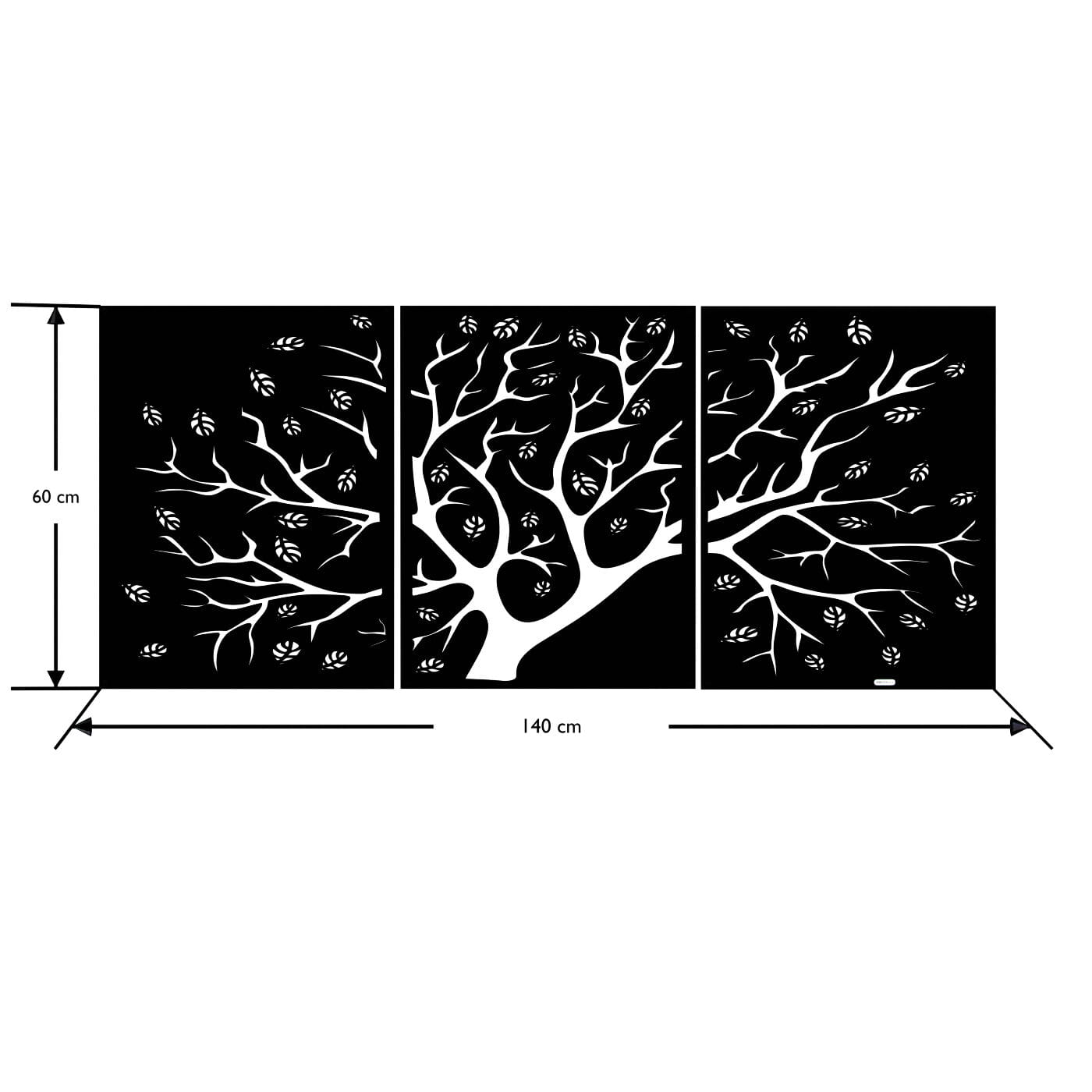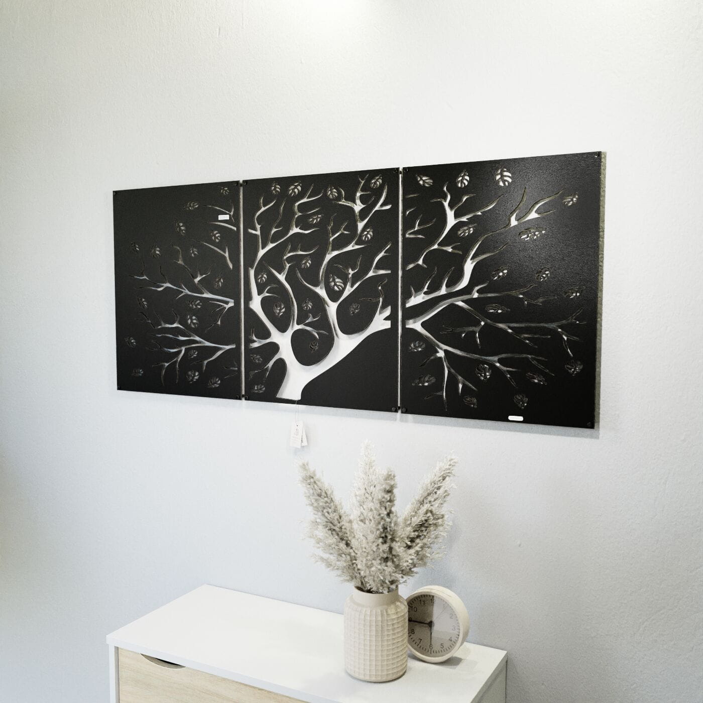 Tryptyk panele dekoracyjne drzewoTryptyk dekoracyjny z motywem drzewa to wyrazista ozdoba na ścianę, która zachwyca swoją prostotą i subtelnością natury. Trzy panele ukazują rozłożyste gałęzie drzewa, które rozciągają się w różnych kierunkach, tworząc spójną i dynamiczną kompozycję. Laserowo wycięte liście i gałęzie są delikatnie podkreślone kontrastem czerni i światła, co nadaje dekoracji wyjątkowy efekt trójwymiarowości. Ta dekoracja ażurowa doskonale wkomponuje się w nowoczesne wnętrza, nadając im naturalnego charakteru i elegancji. Czarne tło paneli podkreśla szczegółowość wyciętych elementów, a gra światła sprawia, że kompozycja ożywa, tworząc ciekawe cienie na ścianie. Ten panel dekoracyjny z motywem drzewa świetnie sprawdzi się w salonie, sypialni lub jadalni, wprowadzając do wnętrza spokój i harmonię. Dla miłośników natury i minimalistycznych wzorów, ten tryptyk to doskonały wybór, który nada wnętrzu stylu i unikalnego charakteru.