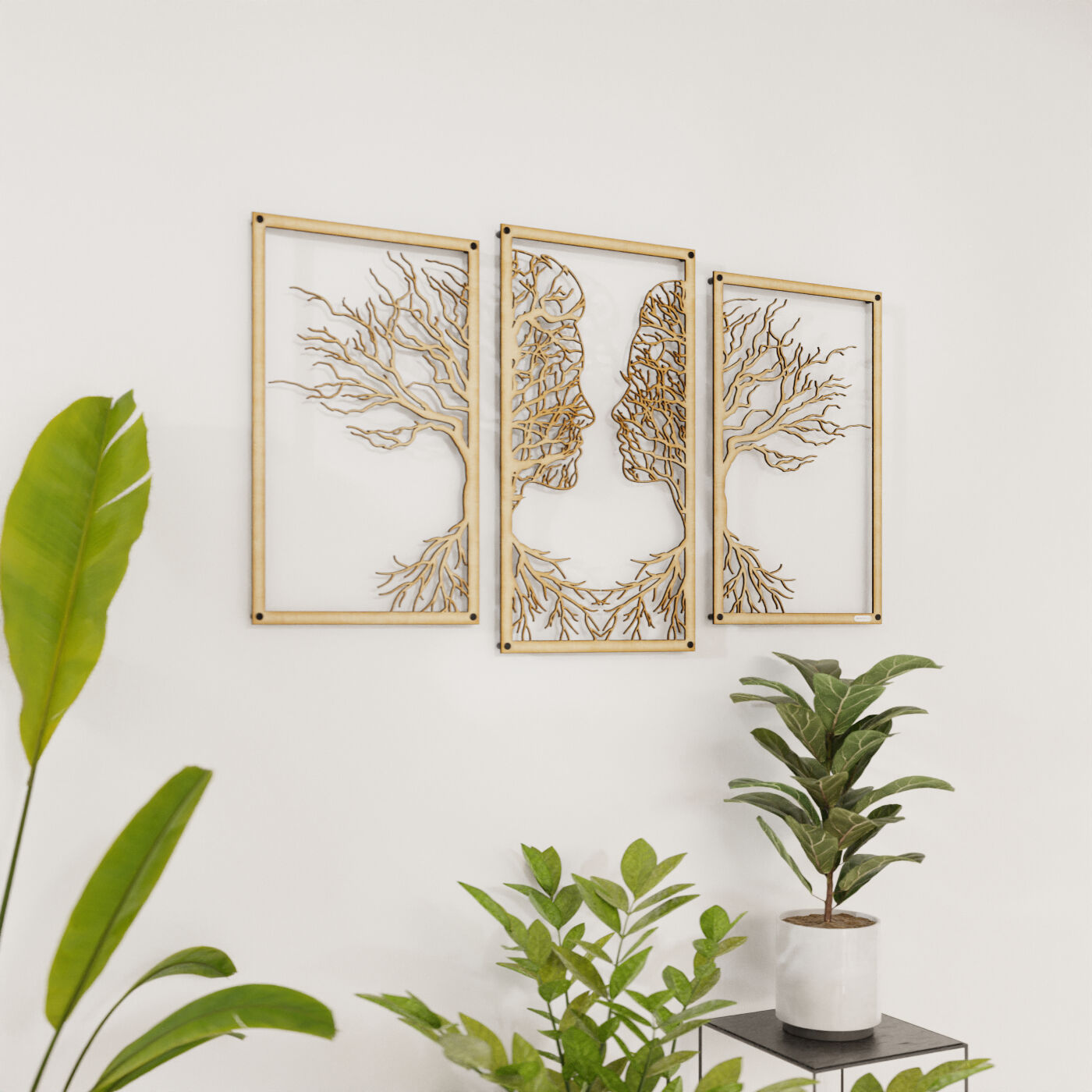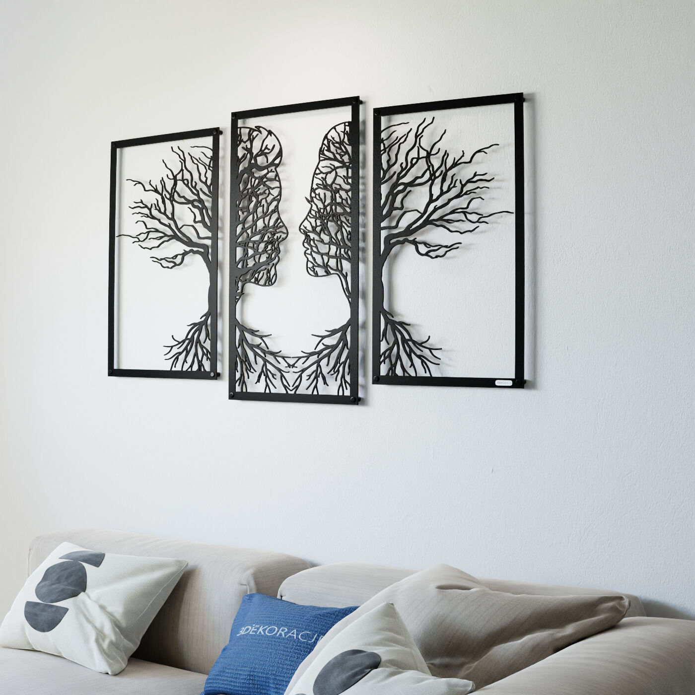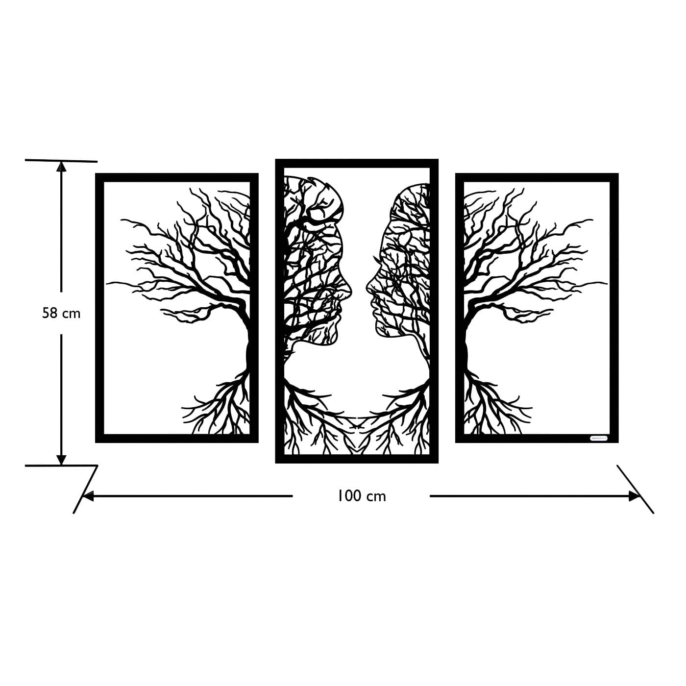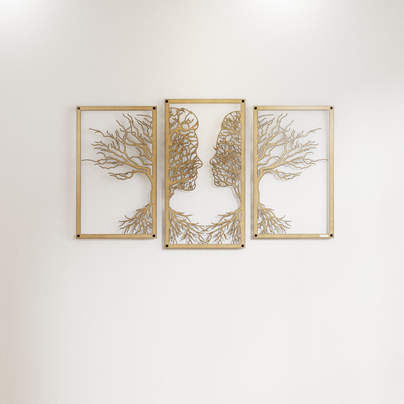 Tryptyk drzewo zakochaniTen tryptyk ażurowy przedstawia symboliczny obraz dwóch twarzy, które stopniowo łączą się w delikatnie splecione drzewa, wyrażając bliskość i więź między postaciami. Korzenie postaci, które wyrastają w dolnej części, podkreślają motyw wzajemnego powiązania, co nadaje tej dekoracji nie tylko wizualnej, ale i emocjonalnej głębi. Precyzyjnie wykonane laserowe wycięcia dodają niezwykłej lekkości tej konstrukcji, tworząc elegancki, subtelny efekt na każdej ścianie. Ten panel ścienny jest wyjątkowo wszechstronny i może być doskonałą ozdobą w wielu pomieszczeniach, takich jak salon, sypialnia czy jadalnia. Jego artystyczna forma świetnie komponuje się z wnętrzami urządzonymi w stylu minimalistycznym, nowoczesnym czy nawet rustykalnym, dodając im osobistego, romantycznego akcentu. Dekoracja jest wykonana z drewna, dostępna zarówno w wersji ze sklejki, jak i płyty laminowanej, co czyni ją lekką i prostą w montażu. Dzięki zastosowaniu dystansów montażowych, ozdoba subtelnie odstaje od ściany, co tworzy efekt trójwymiarowości, przyciągający uwagę każdego, kto na nią spojrzy.