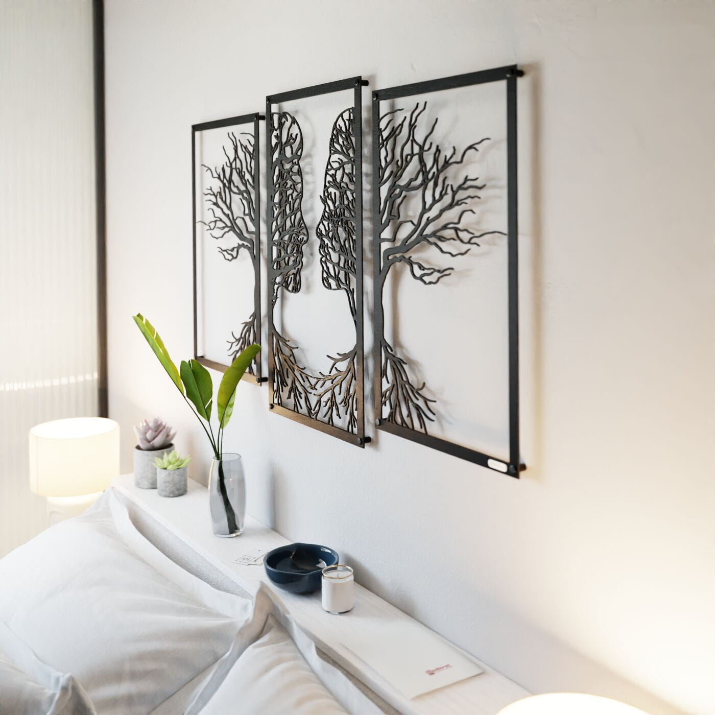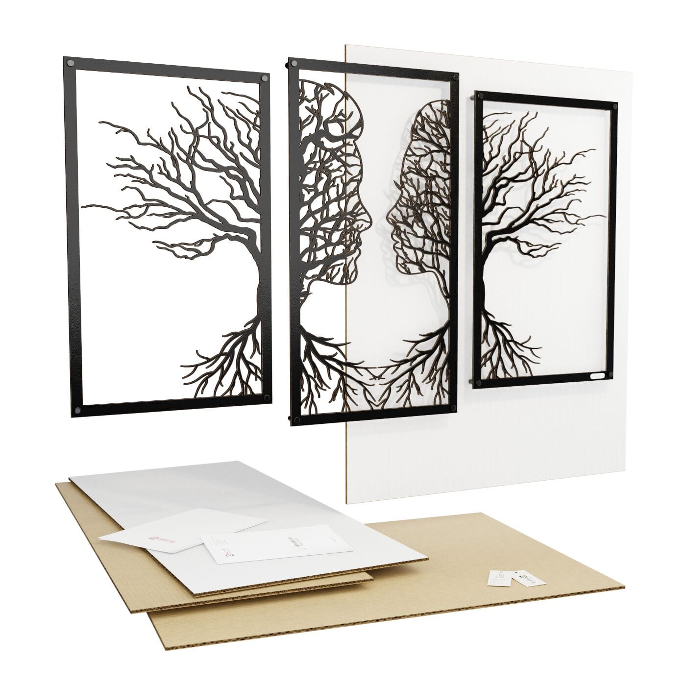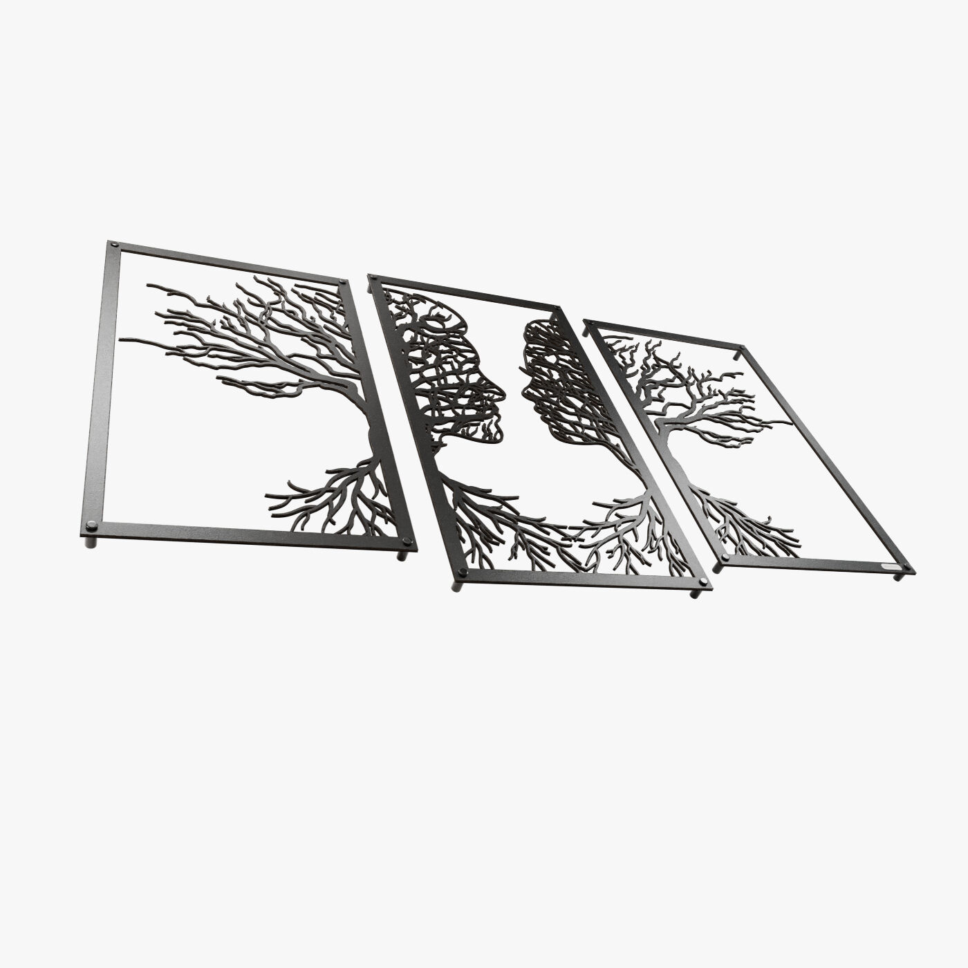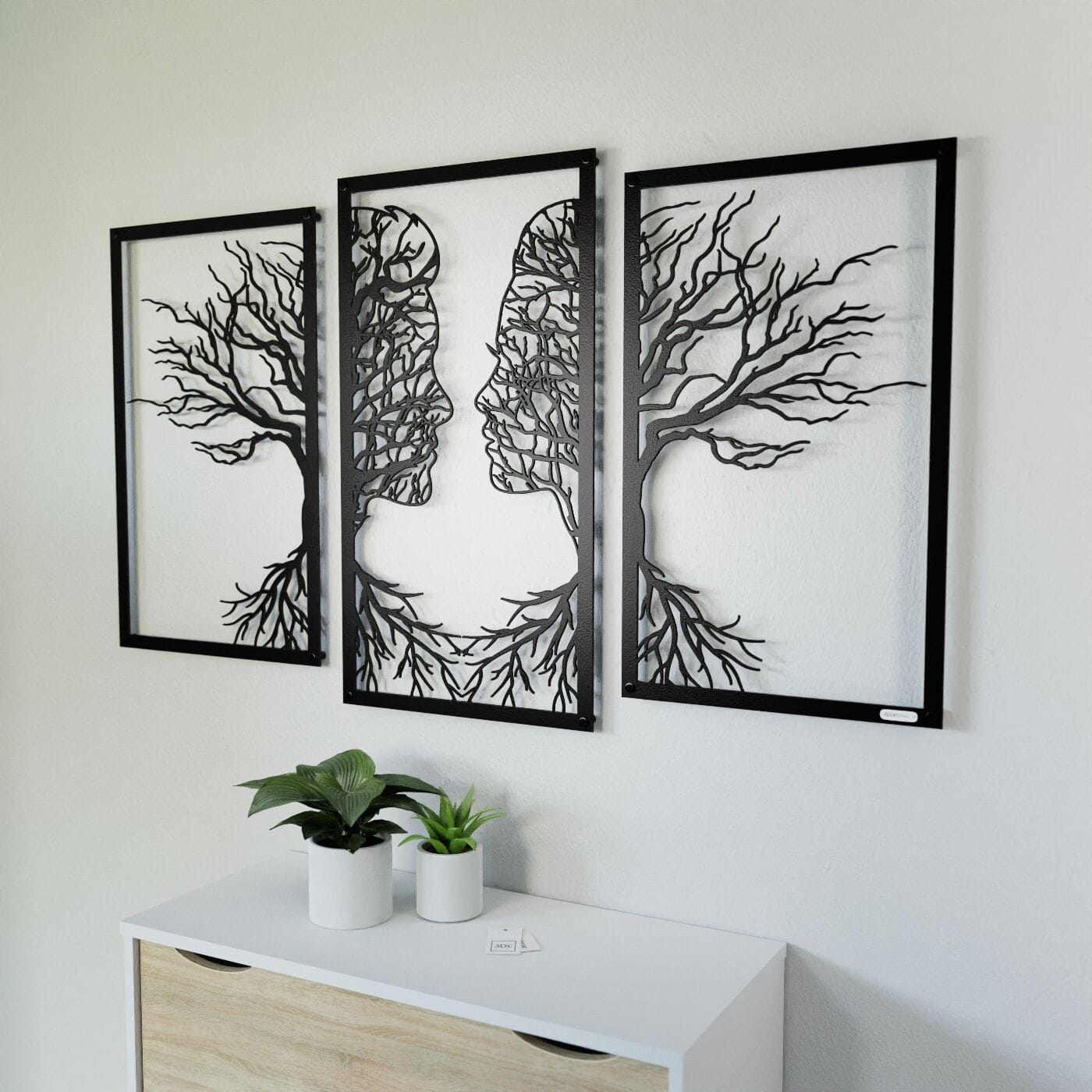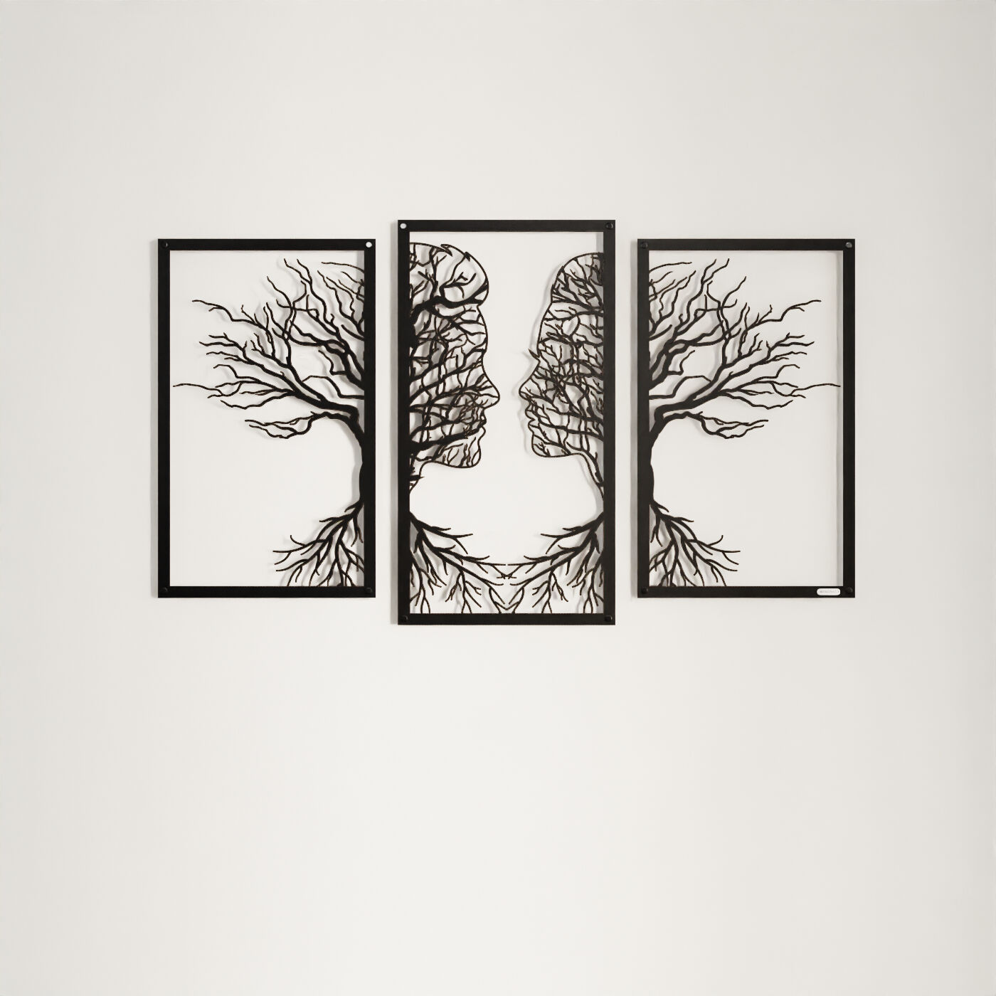 Tryptyk drzewo zakochaniTen tryptyk ażurowy przedstawia symboliczny obraz dwóch twarzy, które stopniowo łączą się w delikatnie splecione drzewa, wyrażając bliskość i więź między postaciami. Korzenie postaci, które wyrastają w dolnej części, podkreślają motyw wzajemnego powiązania, co nadaje tej dekoracji nie tylko wizualnej, ale i emocjonalnej głębi. Precyzyjnie wykonane laserowe wycięcia dodają niezwykłej lekkości tej konstrukcji, tworząc elegancki, subtelny efekt na każdej ścianie. Ten panel ścienny jest wyjątkowo wszechstronny i może być doskonałą ozdobą w wielu pomieszczeniach, takich jak salon, sypialnia czy jadalnia. Jego artystyczna forma świetnie komponuje się z wnętrzami urządzonymi w stylu minimalistycznym, nowoczesnym czy nawet rustykalnym, dodając im osobistego, romantycznego akcentu. Dekoracja jest wykonana z drewna, dostępna zarówno w wersji ze sklejki, jak i płyty laminowanej, co czyni ją lekką i prostą w montażu. Dzięki zastosowaniu dystansów montażowych, ozdoba subtelnie odstaje od ściany, co tworzy efekt trójwymiarowości, przyciągający uwagę każdego, kto na nią spojrzy.