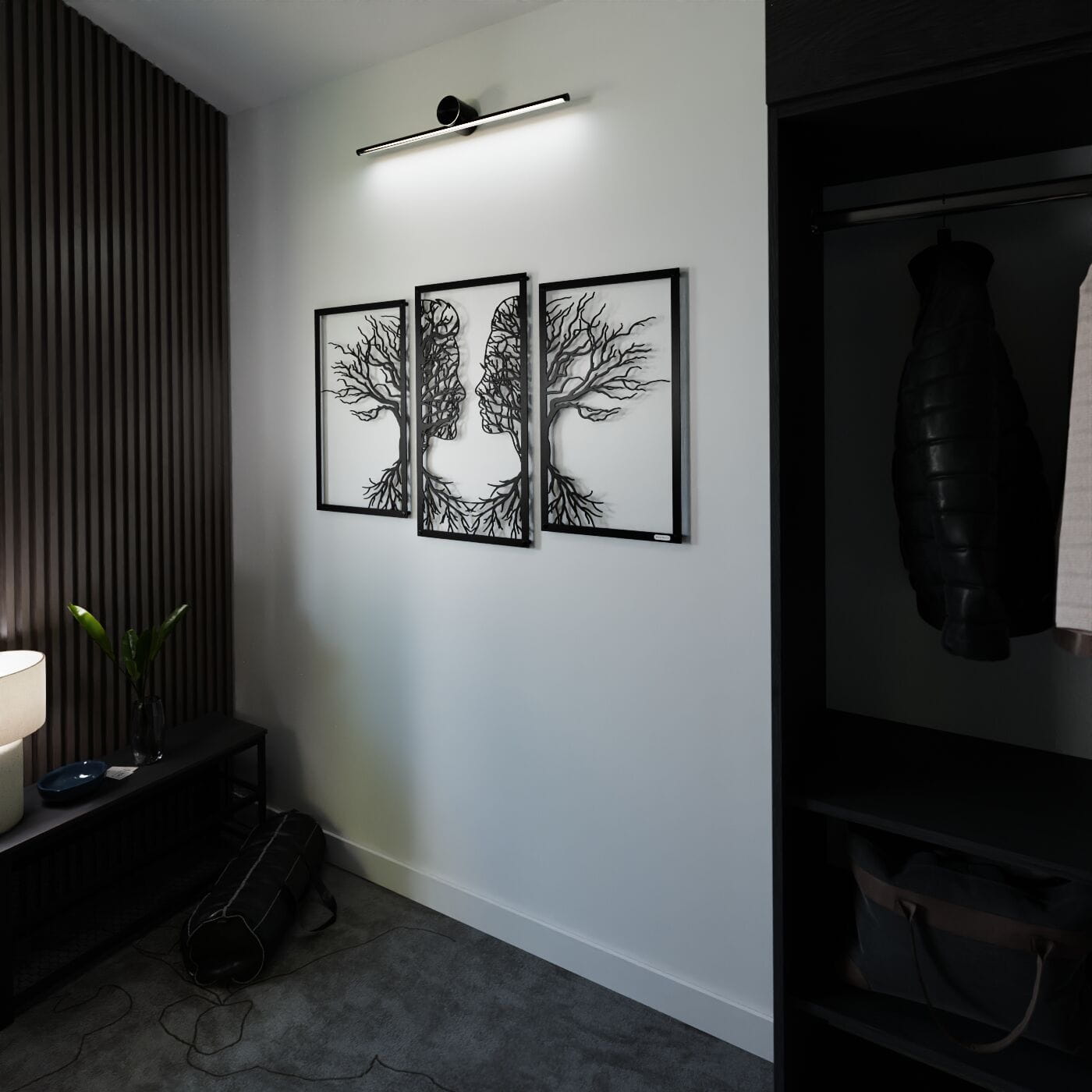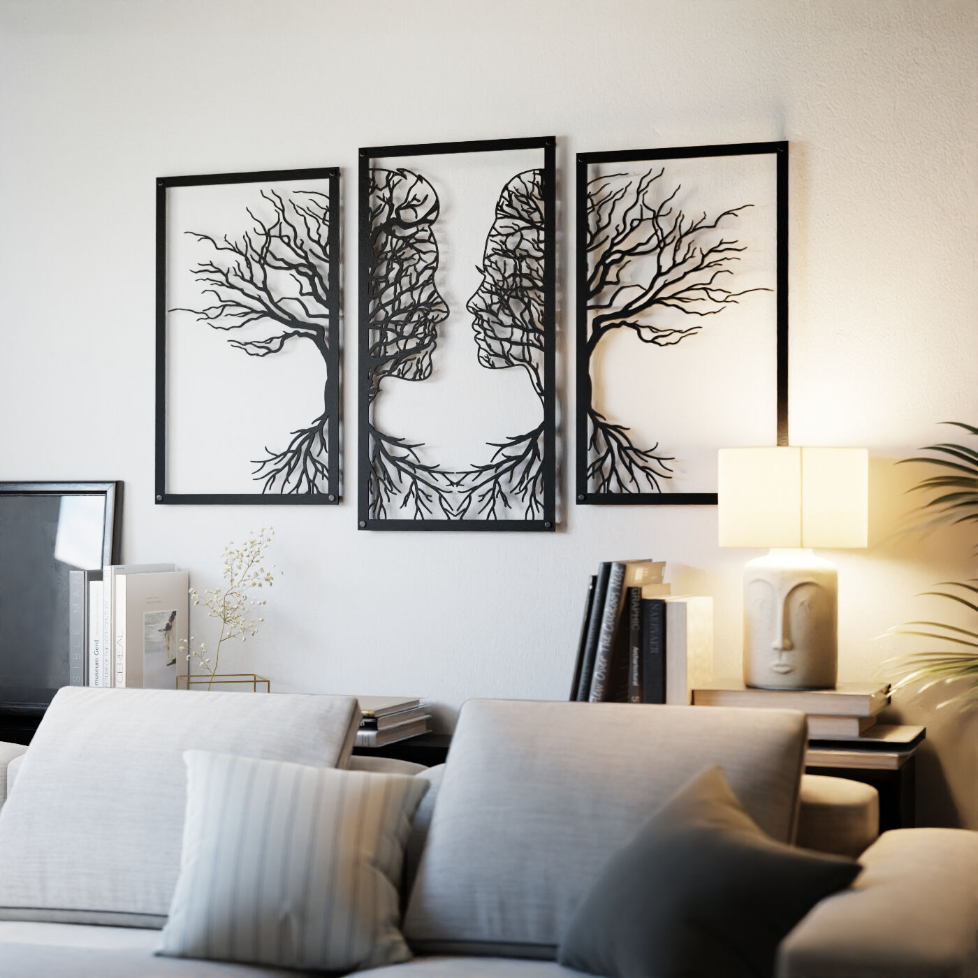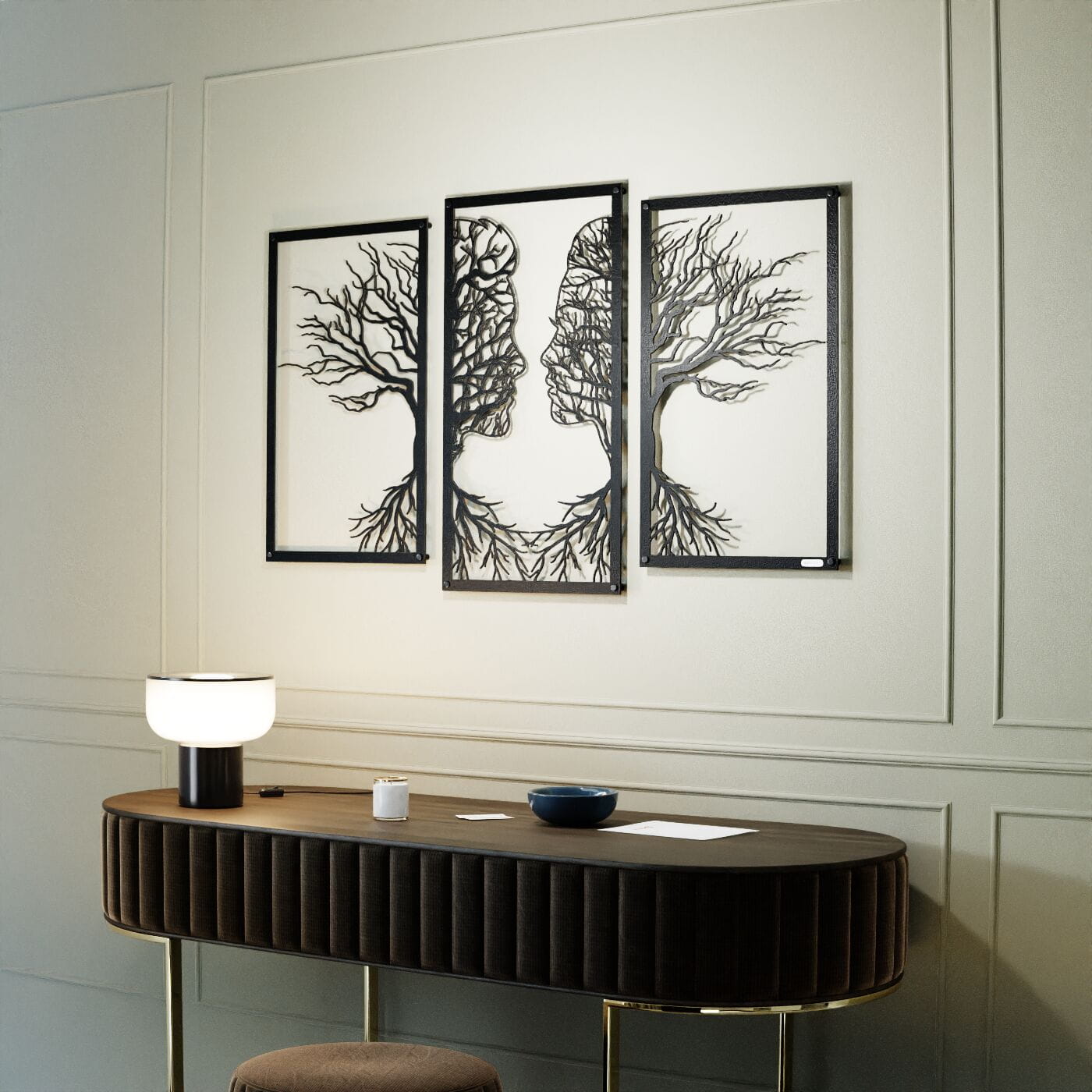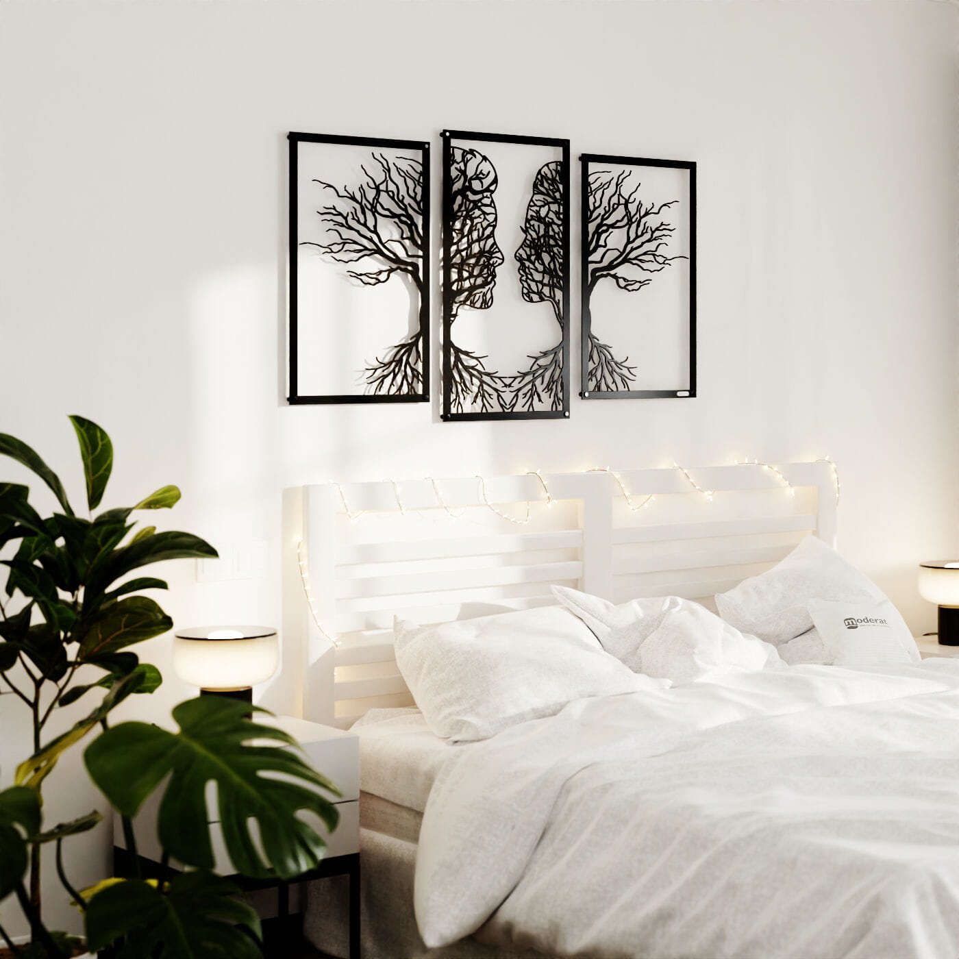 Tryptyk drzewo zakochaniTen tryptyk ażurowy przedstawia symboliczny obraz dwóch twarzy, które stopniowo łączą się w delikatnie splecione drzewa, wyrażając bliskość i więź między postaciami. Korzenie postaci, które wyrastają w dolnej części, podkreślają motyw wzajemnego powiązania, co nadaje tej dekoracji nie tylko wizualnej, ale i emocjonalnej głębi. Precyzyjnie wykonane laserowe wycięcia dodają niezwykłej lekkości tej konstrukcji, tworząc elegancki, subtelny efekt na każdej ścianie. Ten panel ścienny jest wyjątkowo wszechstronny i może być doskonałą ozdobą w wielu pomieszczeniach, takich jak salon, sypialnia czy jadalnia. Jego artystyczna forma świetnie komponuje się z wnętrzami urządzonymi w stylu minimalistycznym, nowoczesnym czy nawet rustykalnym, dodając im osobistego, romantycznego akcentu. Dekoracja jest wykonana z drewna, dostępna zarówno w wersji ze sklejki, jak i płyty laminowanej, co czyni ją lekką i prostą w montażu. Dzięki zastosowaniu dystansów montażowych, ozdoba subtelnie odstaje od ściany, co tworzy efekt trójwymiarowości, przyciągający uwagę każdego, kto na nią spojrzy.